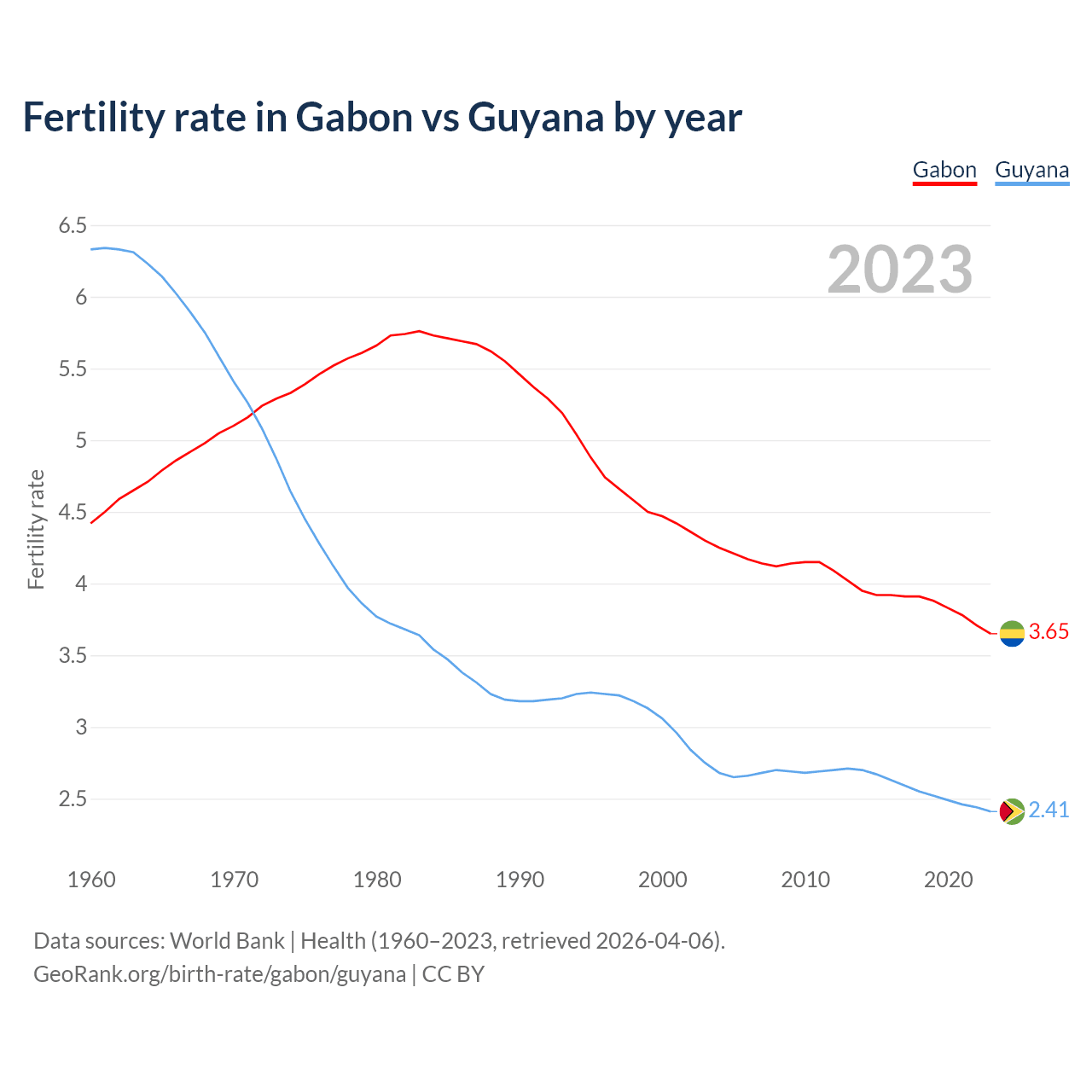 1960 vs 2023, the fertility rate has decreased by 17.5% in Gabon and by 61.9% in Guyana — in 1960, it was 4.42 and 6.33, respectively.