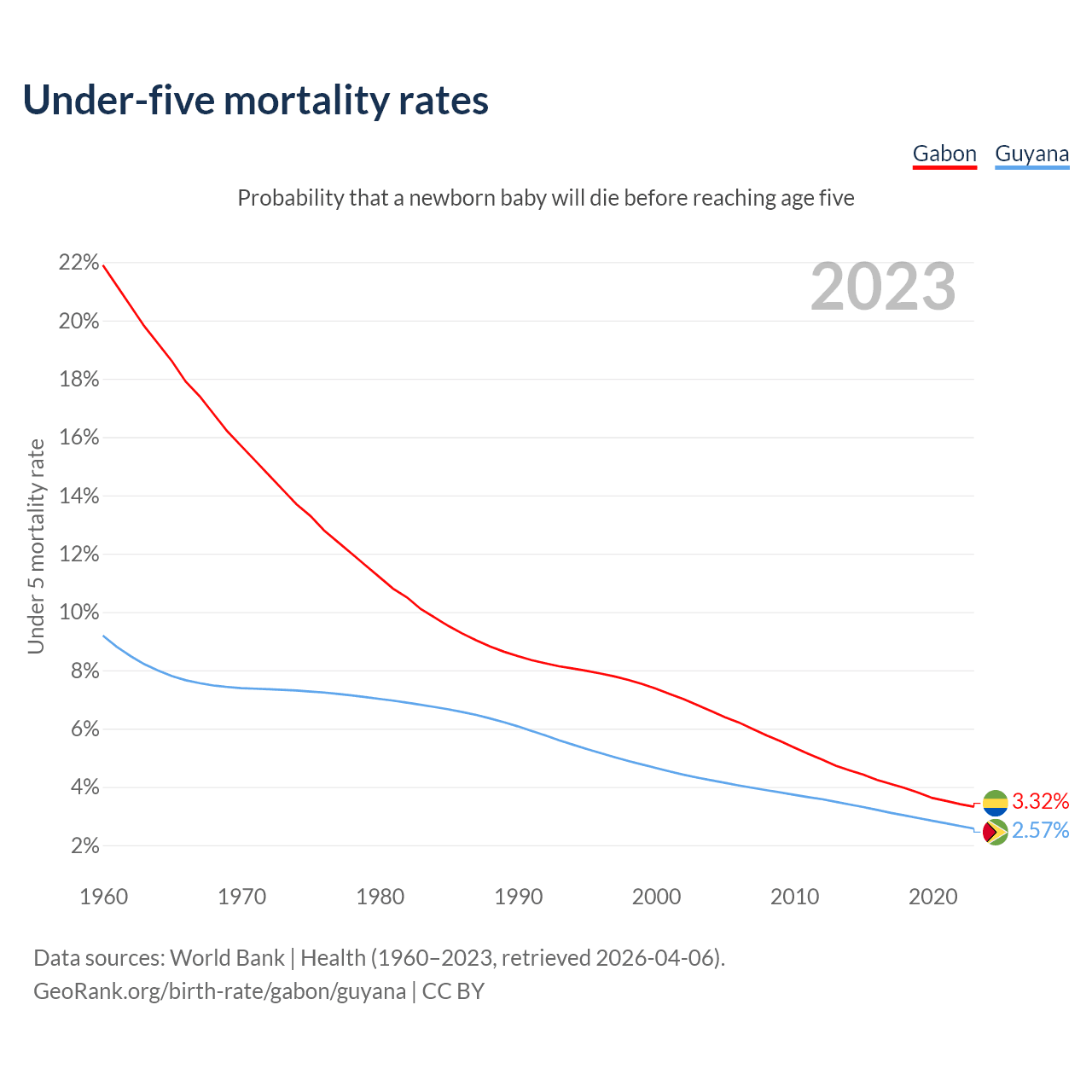 The chance that a newborn baby will die before reaching age five is 3.32% in Gabon and 2.57% in Guyana. Above is a chart with historical data on under-five mortality rates.