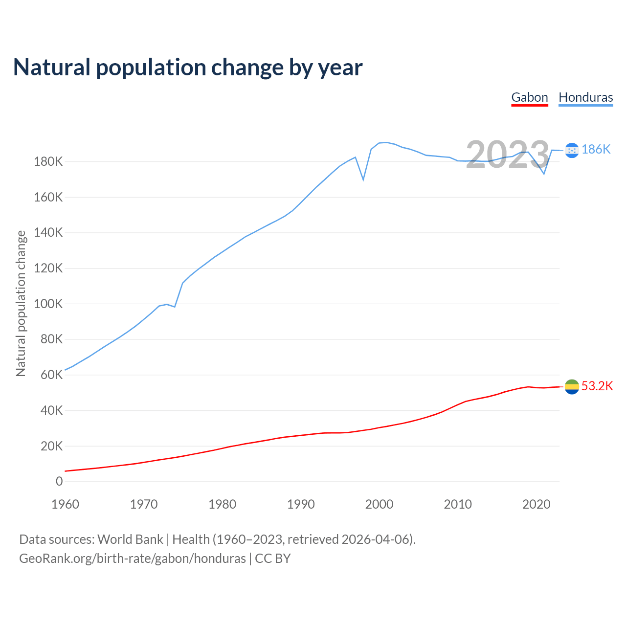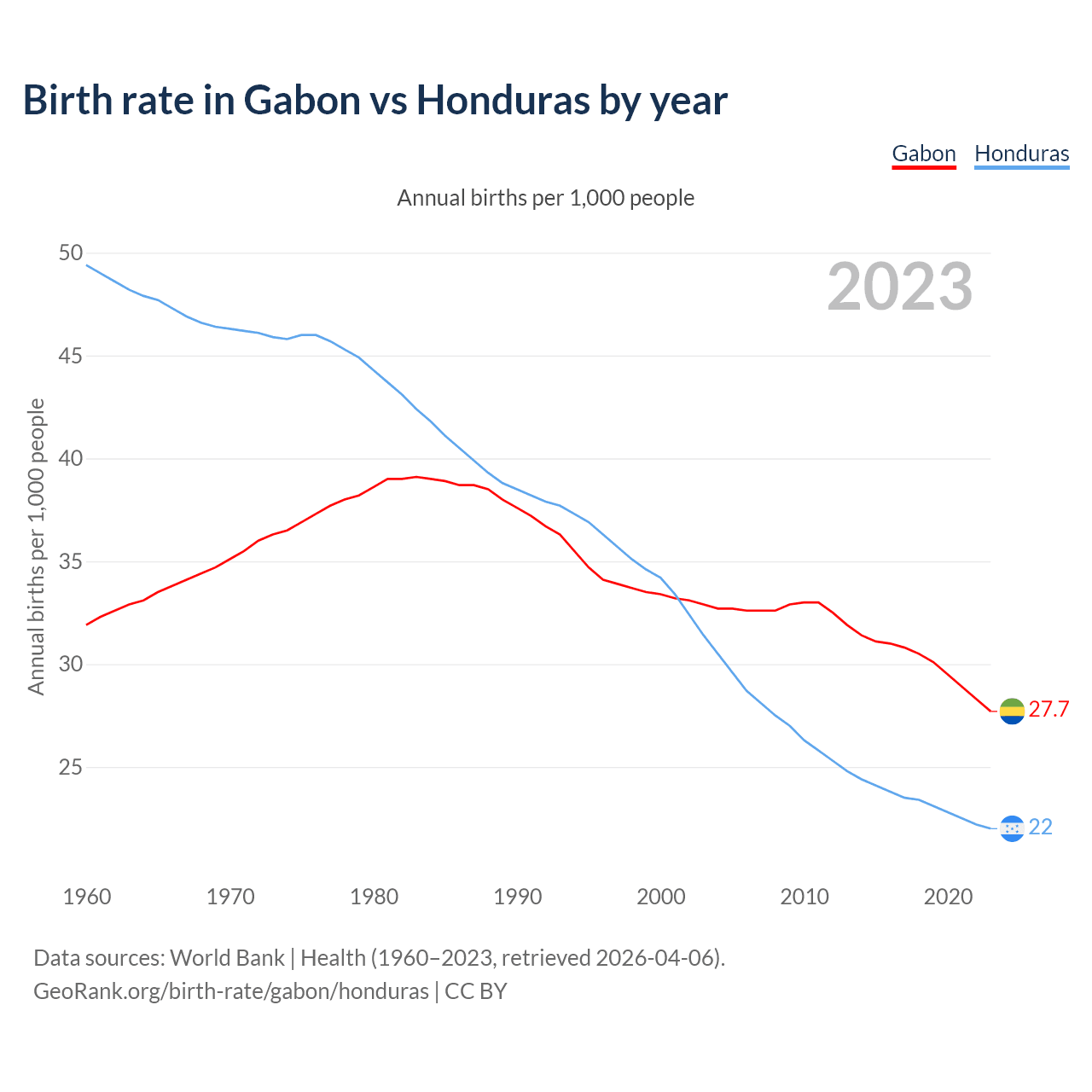 Gabon has an annual birth rate of 27.7 births per 1,000 people, compared to 22 for Honduras. The average number of children a woman is expected to have during her lifetime — the fertility rate, is 3.65 in Gabon and 2.5 in Honduras — 31.5% difference.