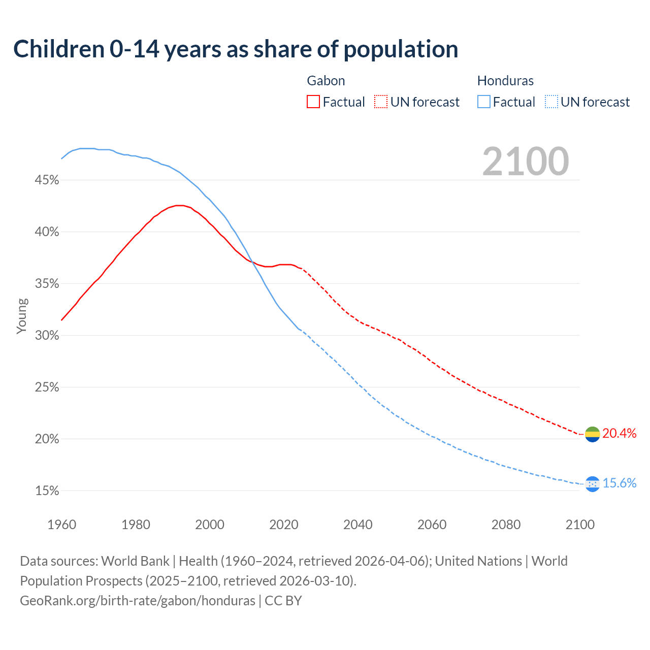 According to the latest available data on birth rates, the fertility rate in Gabon was 3.65 children per woman in 2023, compared to 2.5 in Honduras in 2023. The replacement level is considered to be 2.1 children per woman.