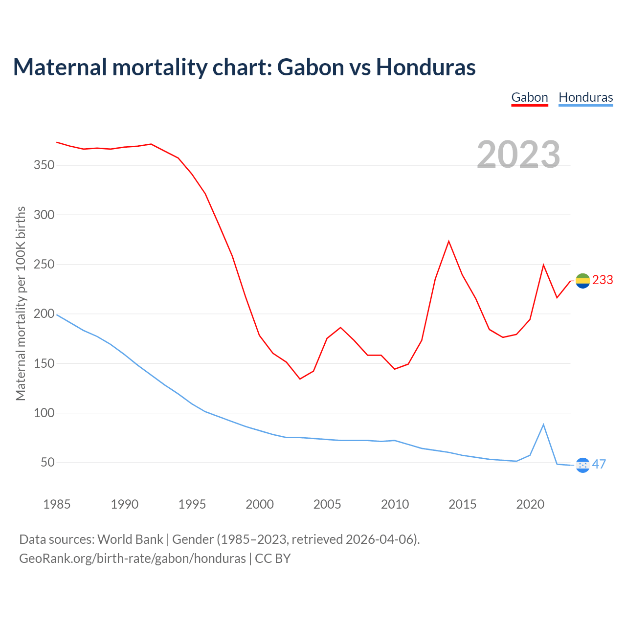 The maternal mortality rate, which is the probability of dying during childbirth or within 42 days of pregnancy termination, is 233 deaths per 100,000 live births in Gabon, compared to 47 deaths in Honduras.