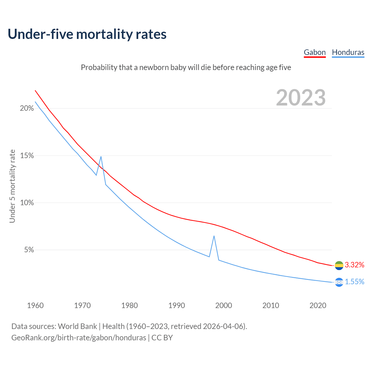 The chance that a newborn baby will die before reaching age five is 3.32% in Gabon and 1.55% in Honduras. Above is a chart with historical data on under-five mortality rates.
