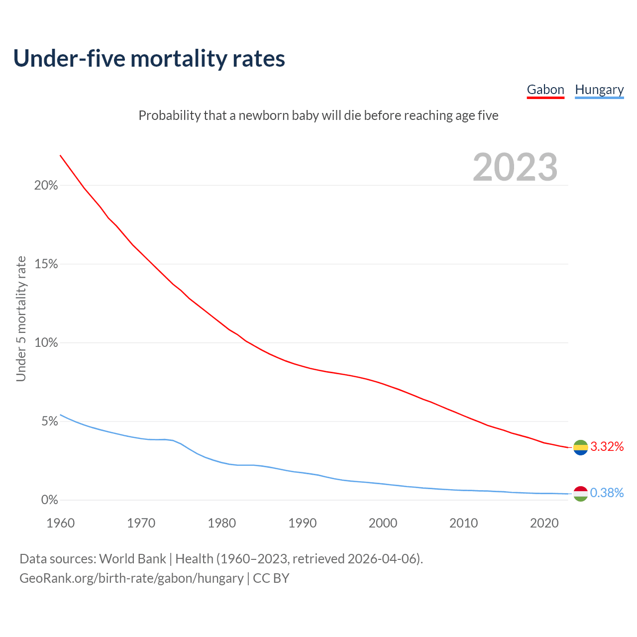 The chance that a newborn baby will die before reaching age five is 3.32% in Gabon and 0.38% in Hungary. Above is a chart with historical data on under-five mortality rates.