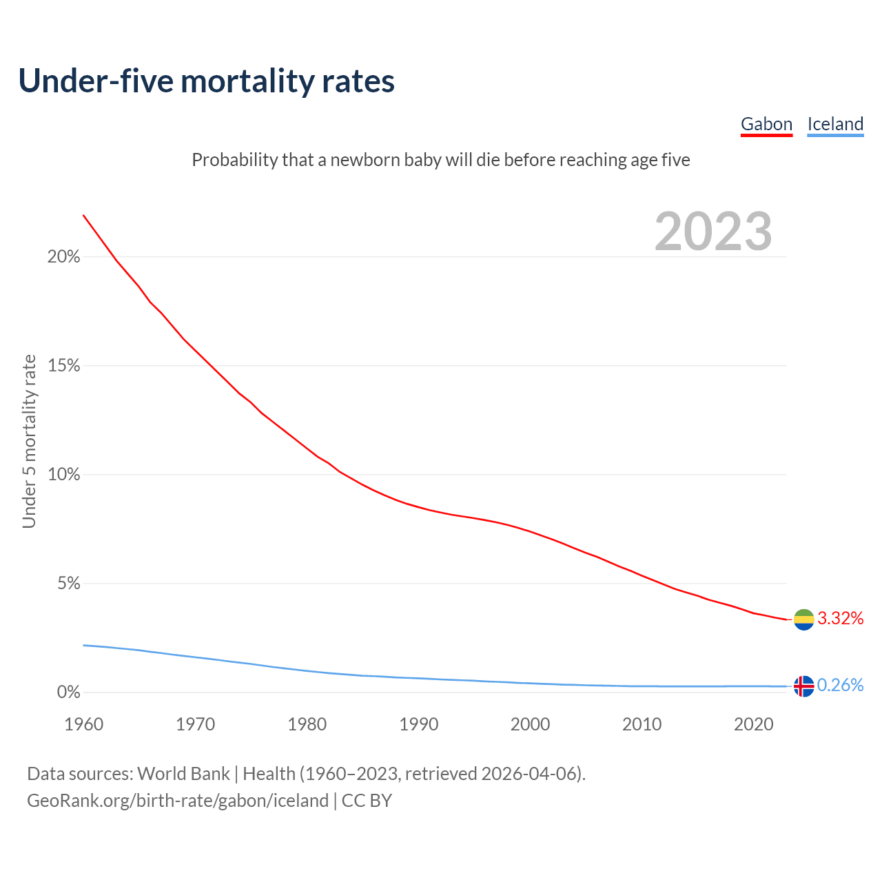 The chance that a newborn baby will die before reaching age five is 3.32% in Gabon and 0.26% in Iceland. Above is a chart with historical data on under-five mortality rates.