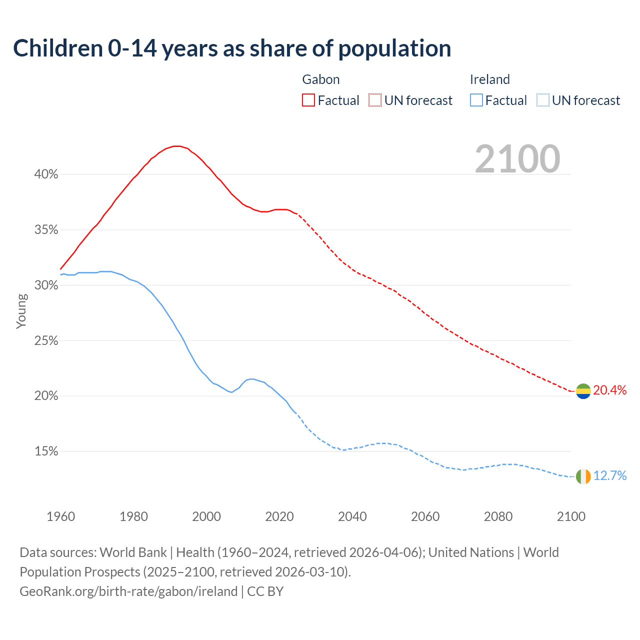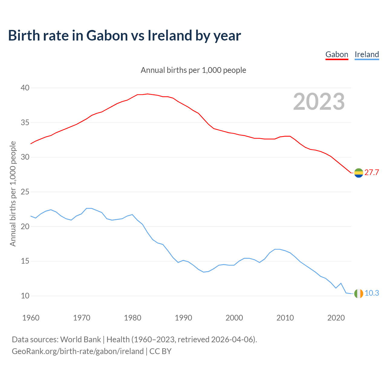 Gabon has an annual birth rate of 27.7 births per 1,000 people, compared to 10.3 for Ireland. The average number of children a woman is expected to have during her lifetime — the fertility rate, is 3.65 in Gabon and 1.5 in Ireland — 58.9% difference.