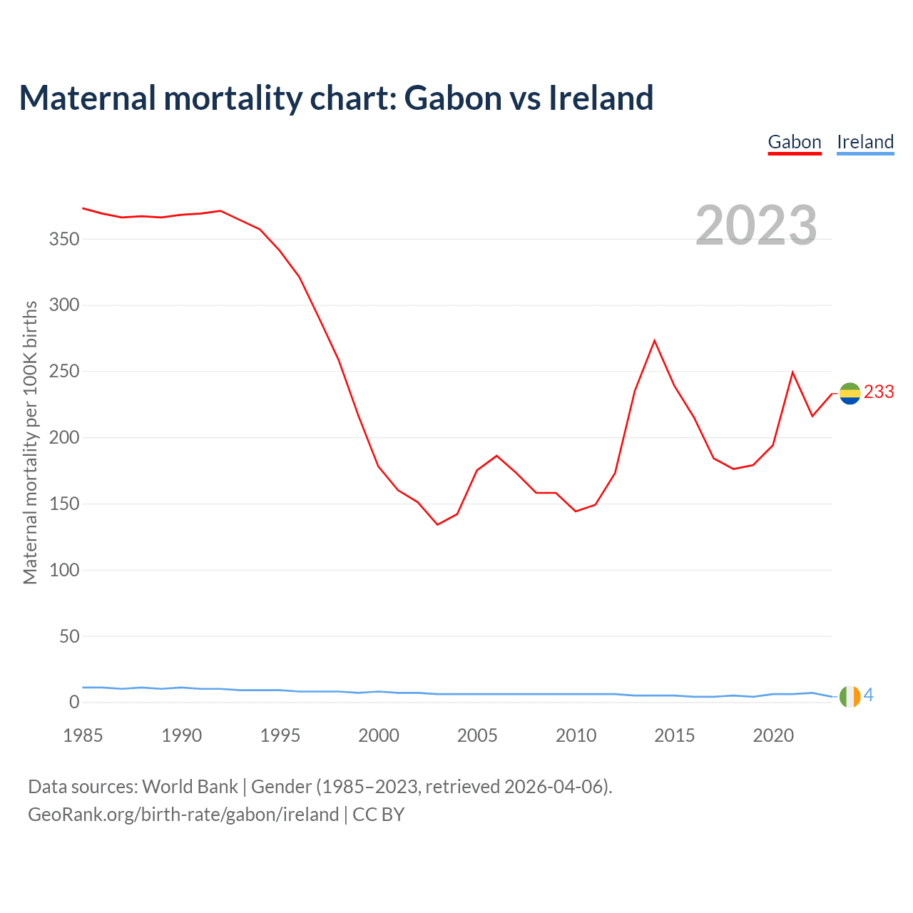 The maternal mortality rate, which is the probability of dying during childbirth or within 42 days of pregnancy termination, is 233 deaths per 100,000 live births in Gabon, compared to 4 deaths in Ireland.