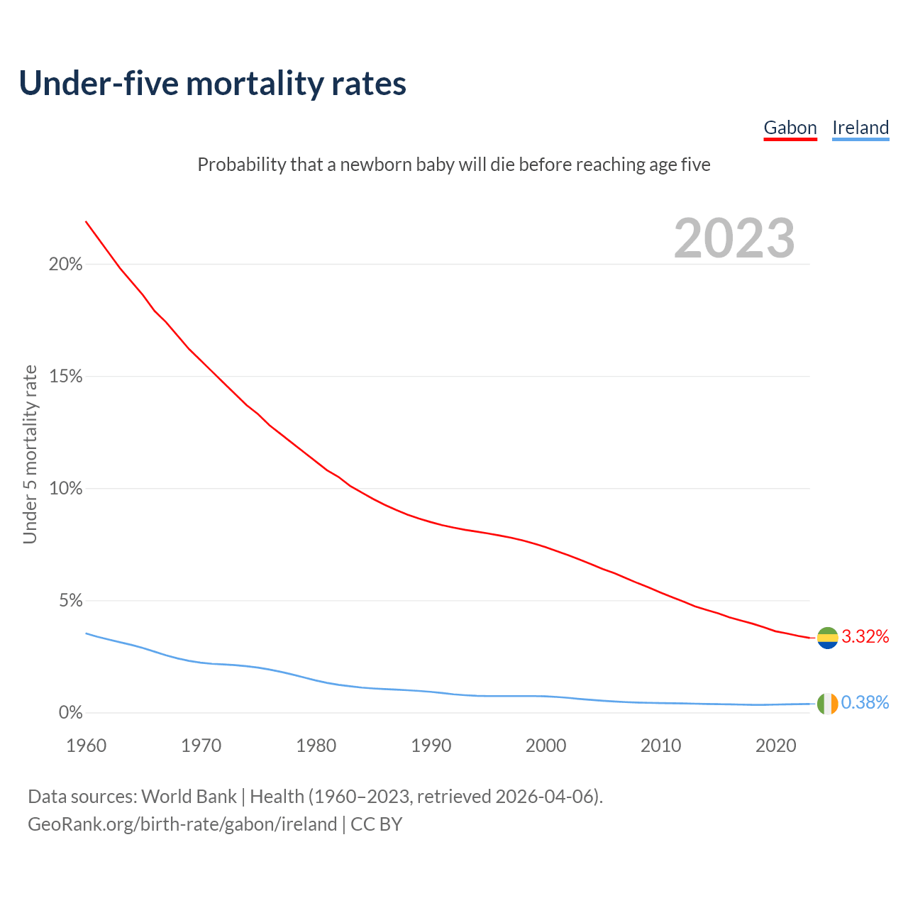 The chance that a newborn baby will die before reaching age five is 3.32% in Gabon and 0.38% in Ireland. Above is a chart with historical data on under-five mortality rates.