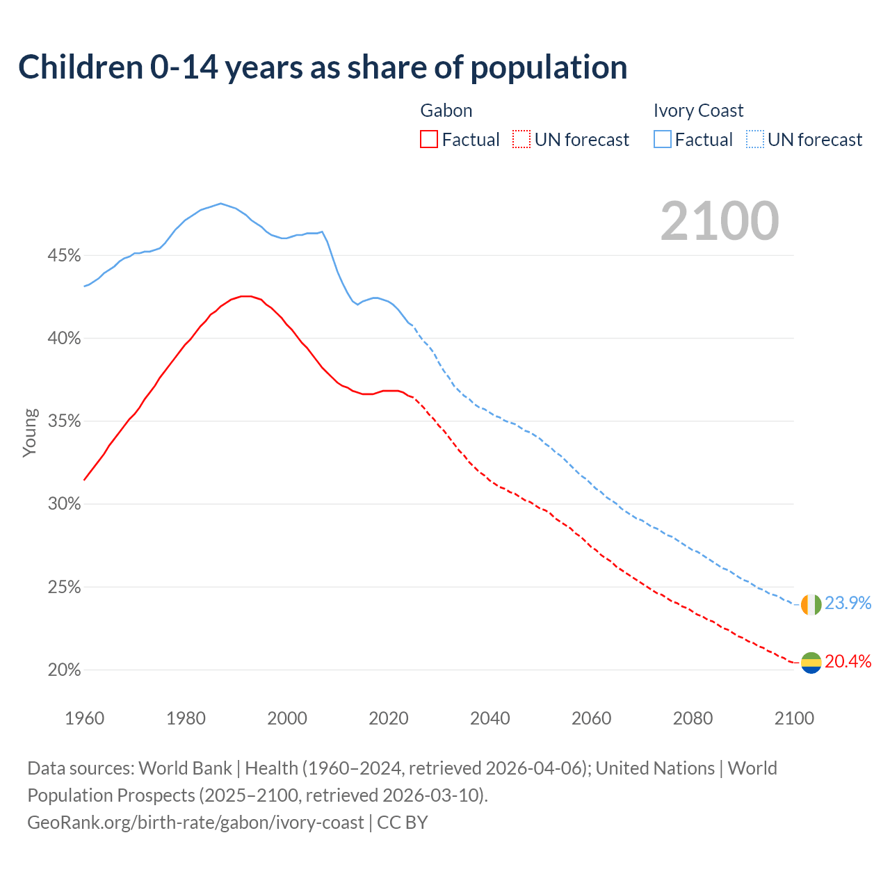 According to the latest available data on birth rates, the fertility rate in Gabon was 3.65 children per woman in 2023, compared to 4.28 in Ivory Coast in 2023. The replacement level is considered to be 2.1 children per woman.