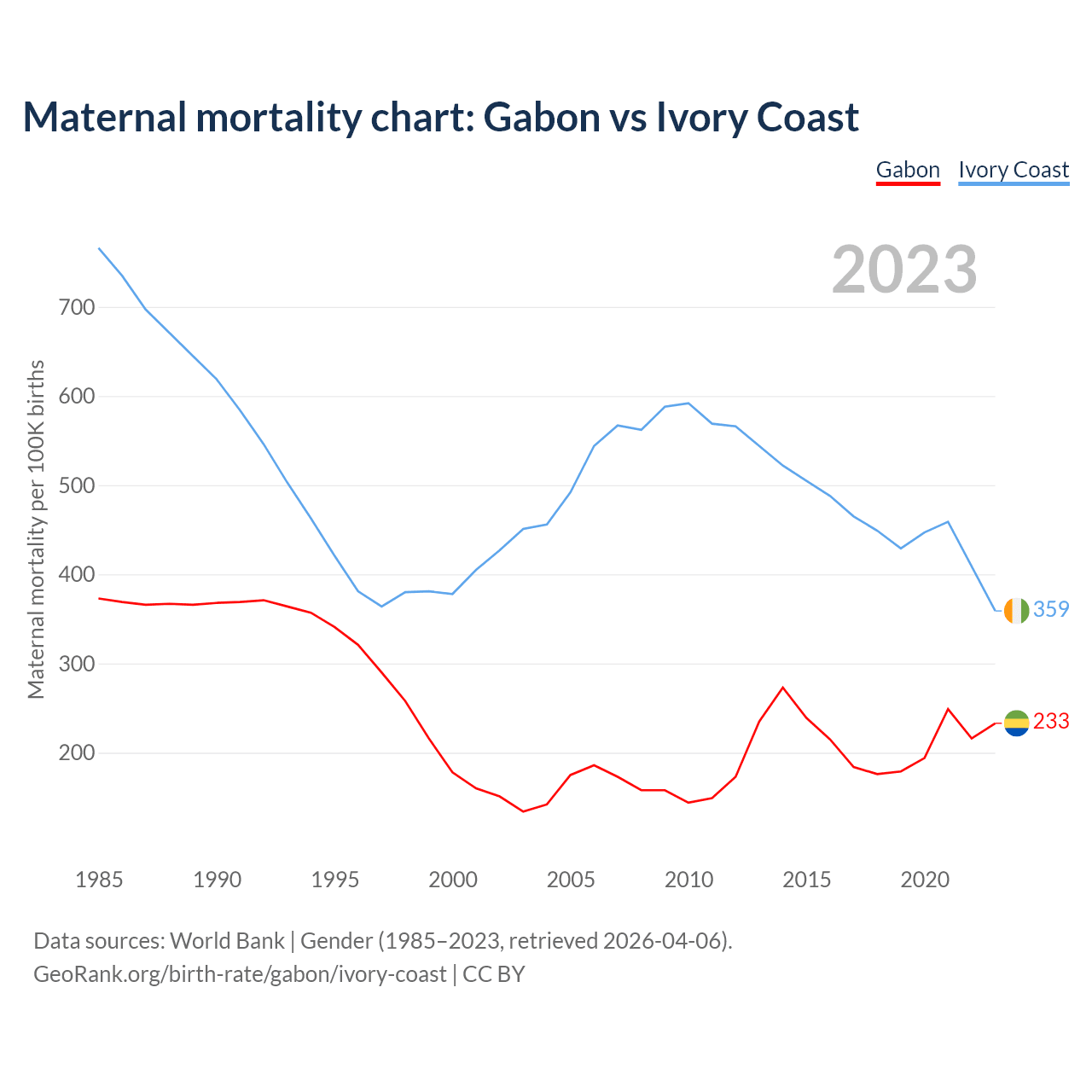The maternal mortality rate, which is the probability of dying during childbirth or within 42 days of pregnancy termination, is 233 deaths per 100,000 live births in Gabon, compared to 359 deaths in Ivory Coast.