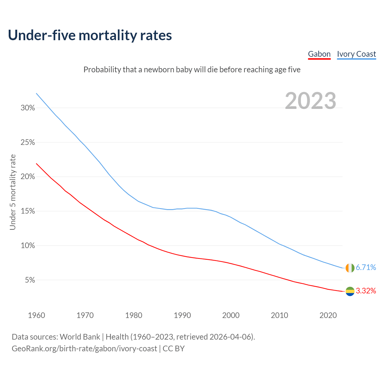 The chance that a newborn baby will die before reaching age five is 3.32% in Gabon and 6.71% in Ivory Coast. Above is a chart with historical data on under-five mortality rates.