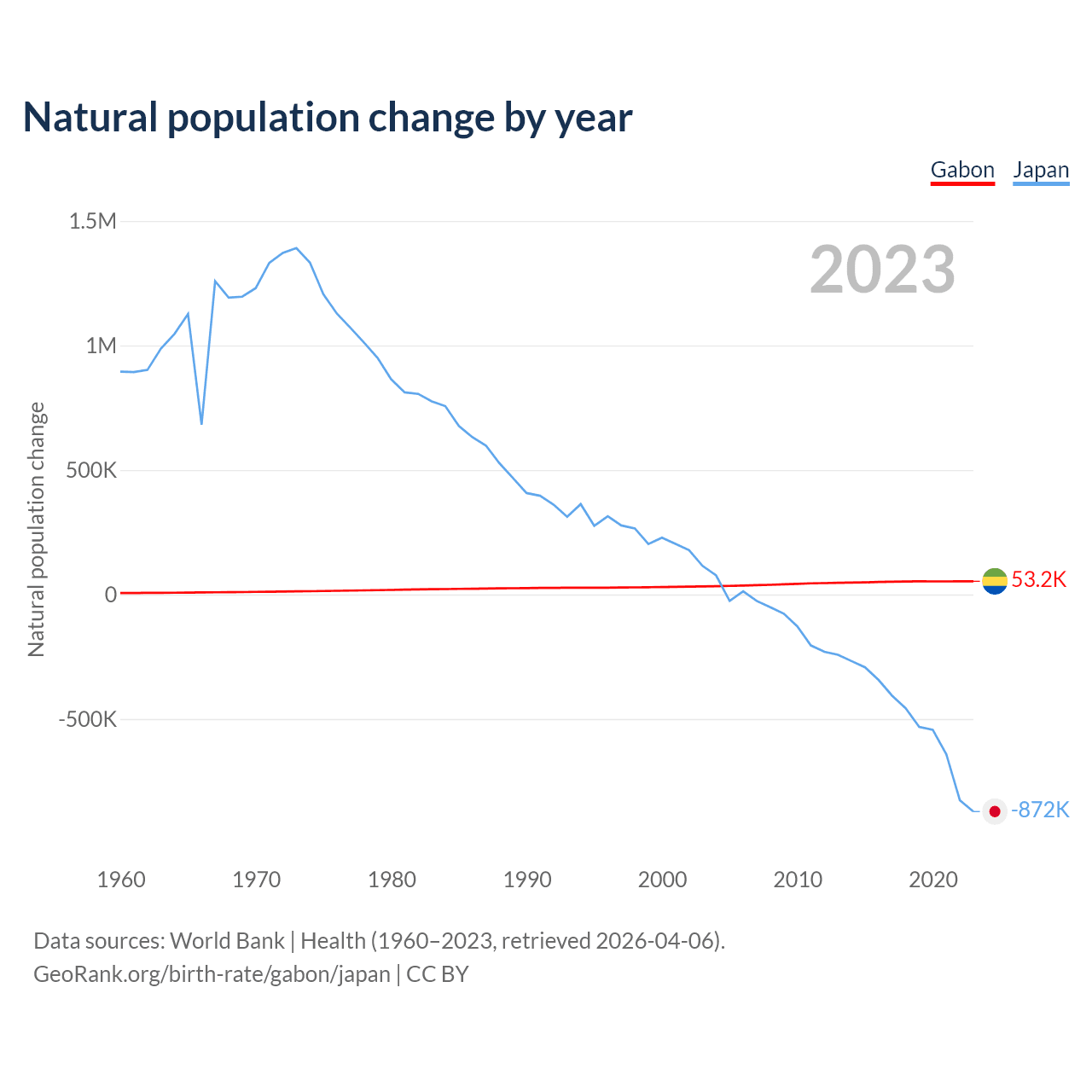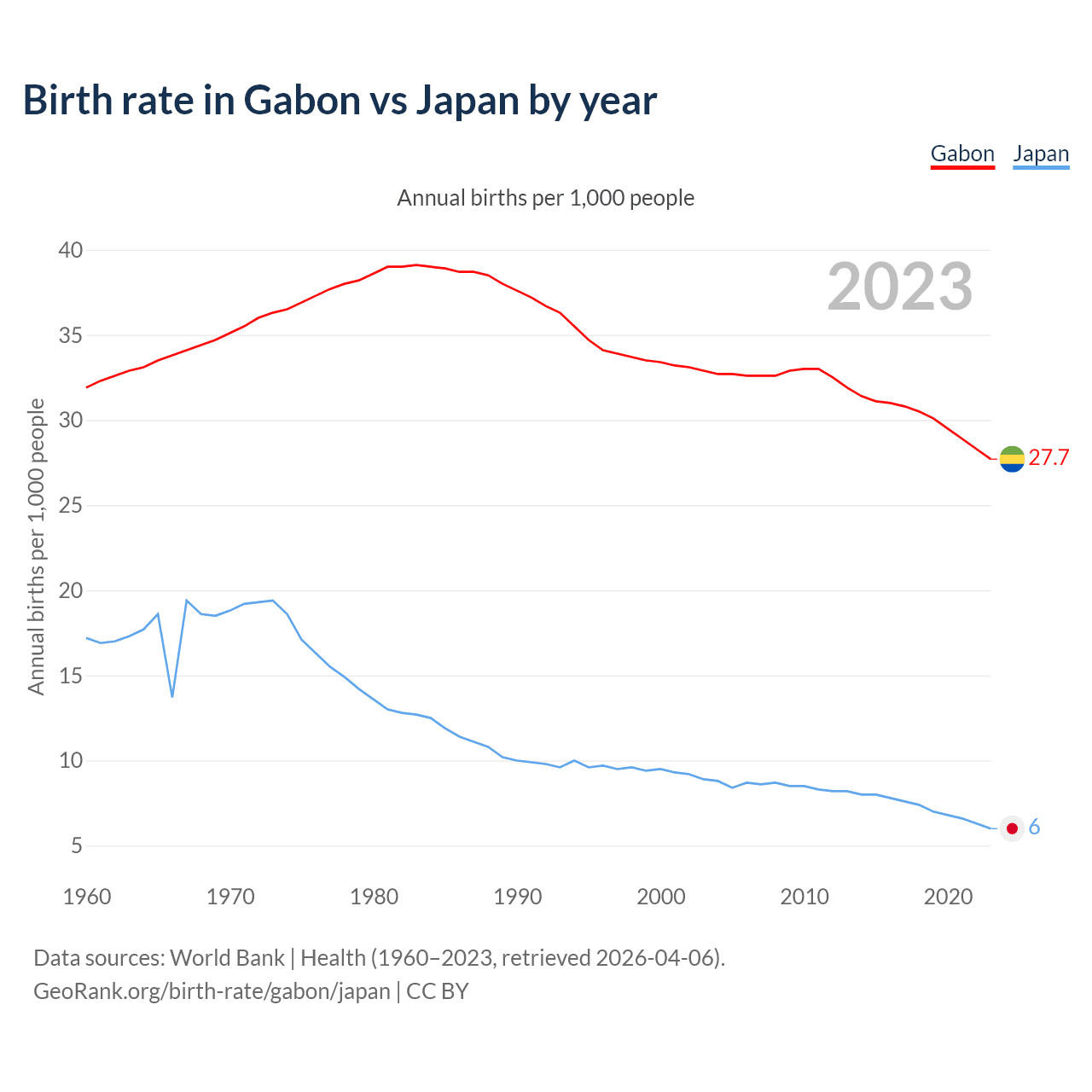 Gabon has an annual birth rate of 27.7 births per 1,000 people, compared to 6 for Japan. The average number of children a woman is expected to have during her lifetime — the fertility rate, is 3.65 in Gabon and 1.2 in Japan — 67.1% difference.