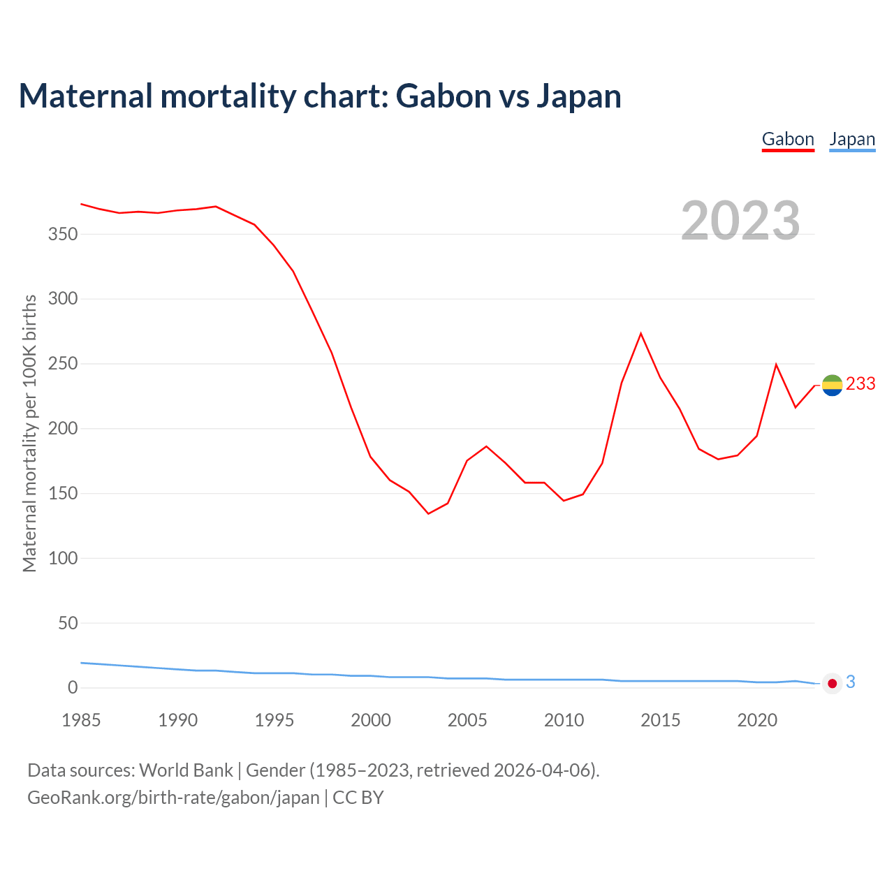 The maternal mortality rate, which is the probability of dying during childbirth or within 42 days of pregnancy termination, is 233 deaths per 100,000 live births in Gabon, compared to 3 deaths in Japan.