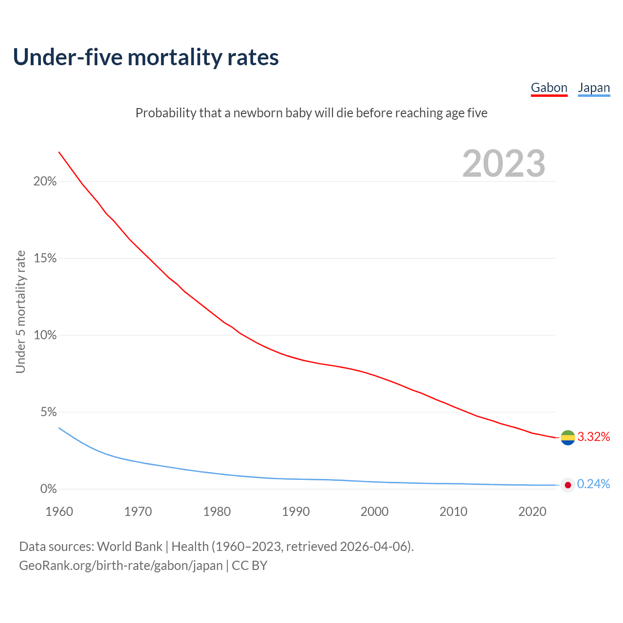 The chance that a newborn baby will die before reaching age five is 3.32% in Gabon and 0.24% in Japan. Above is a chart with historical data on under-five mortality rates.