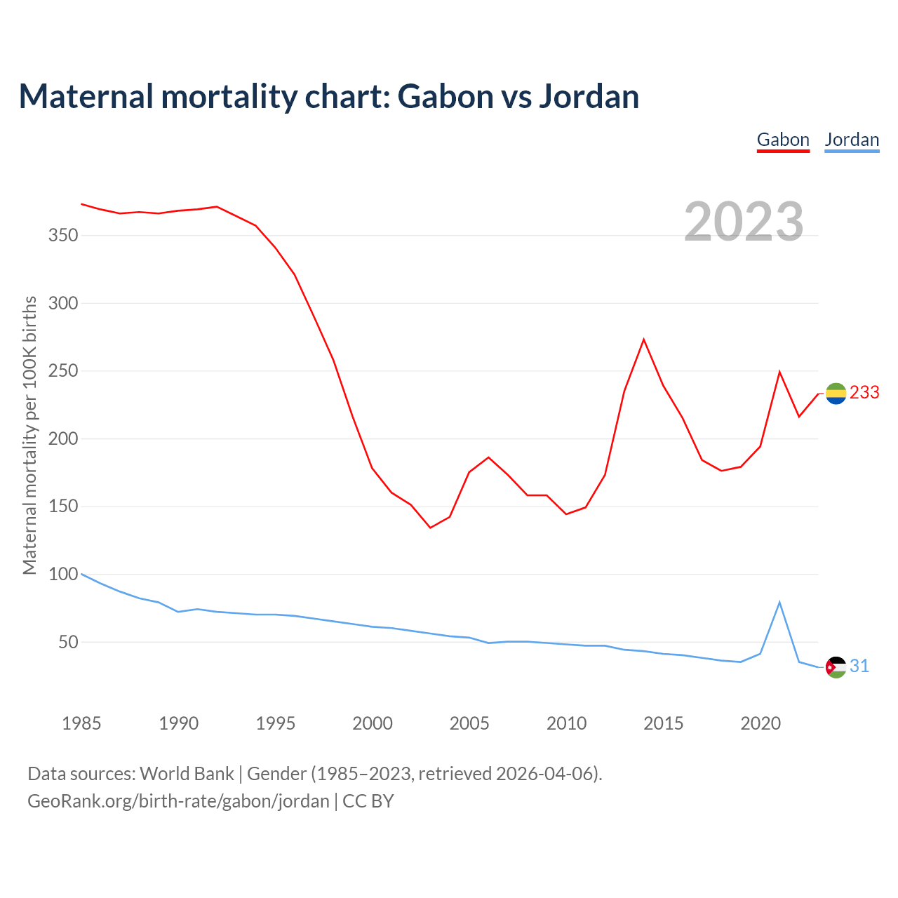 The maternal mortality rate, which is the probability of dying during childbirth or within 42 days of pregnancy termination, is 233 deaths per 100,000 live births in Gabon, compared to 31 deaths in Jordan.