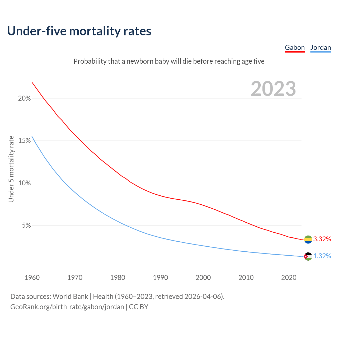 The chance that a newborn baby will die before reaching age five is 3.32% in Gabon and 1.32% in Jordan. Above is a chart with historical data on under-five mortality rates.