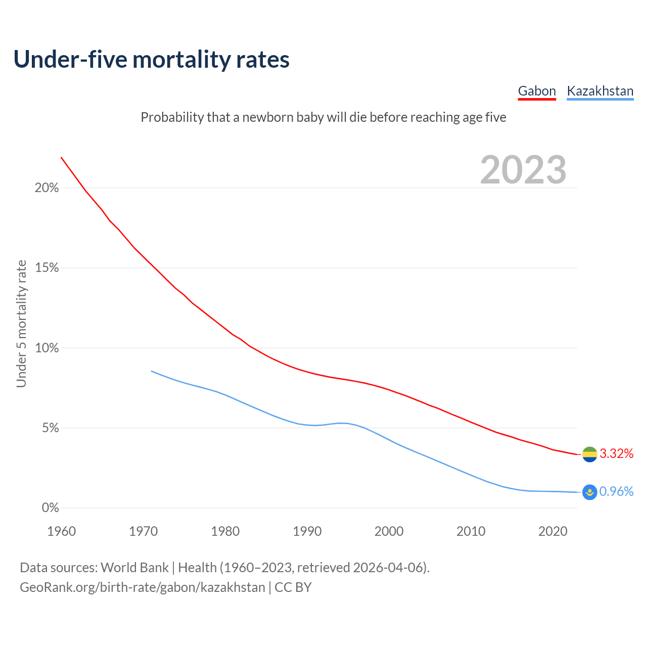 The chance that a newborn baby will die before reaching age five is 3.32% in Gabon and 0.96% in Kazakhstan. Above is a chart with historical data on under-five mortality rates.