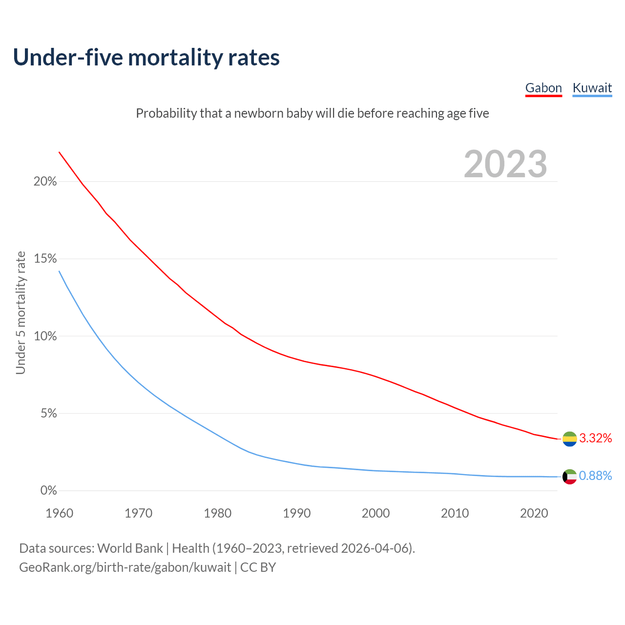 The chance that a newborn baby will die before reaching age five is 3.32% in Gabon and 0.88% in Kuwait. Above is a chart with historical data on under-five mortality rates.