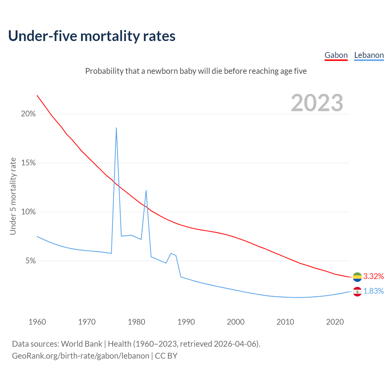 The chance that a newborn baby will die before reaching age five is 3.32% in Gabon and 1.83% in Lebanon. Above is a chart with historical data on under-five mortality rates.