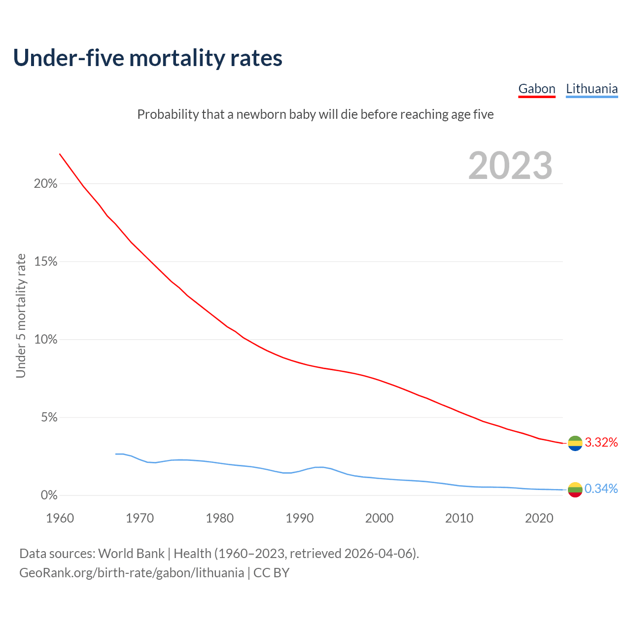 The chance that a newborn baby will die before reaching age five is 3.32% in Gabon and 0.34% in Lithuania. Above is a chart with historical data on under-five mortality rates.