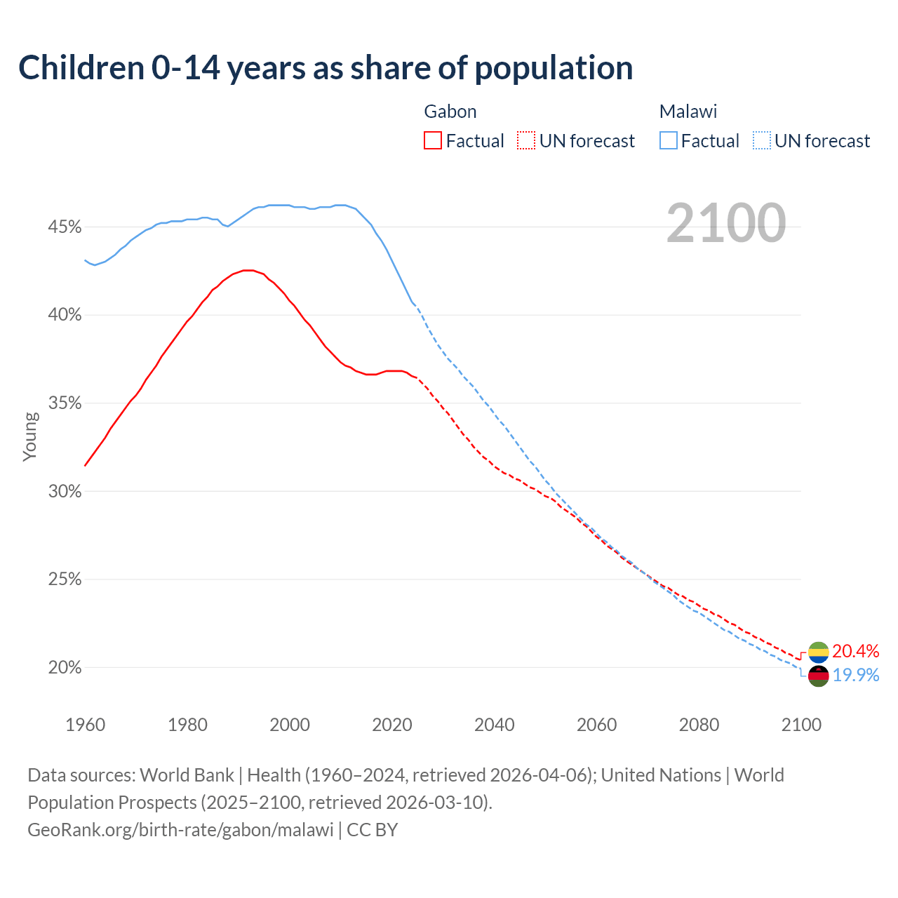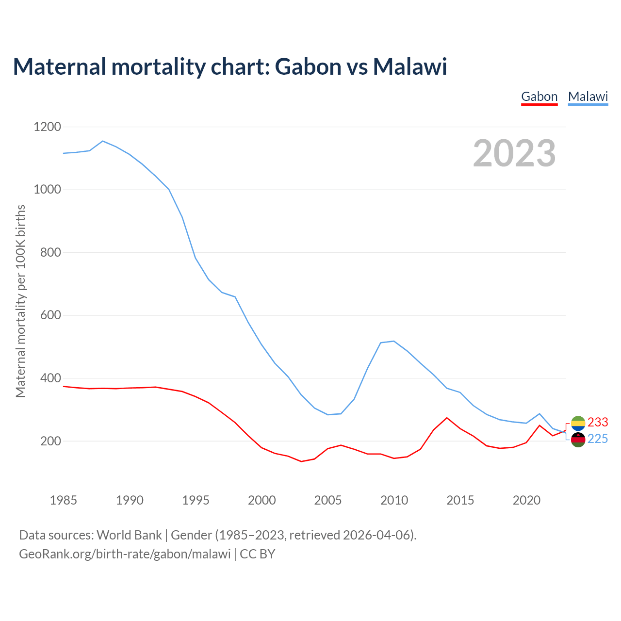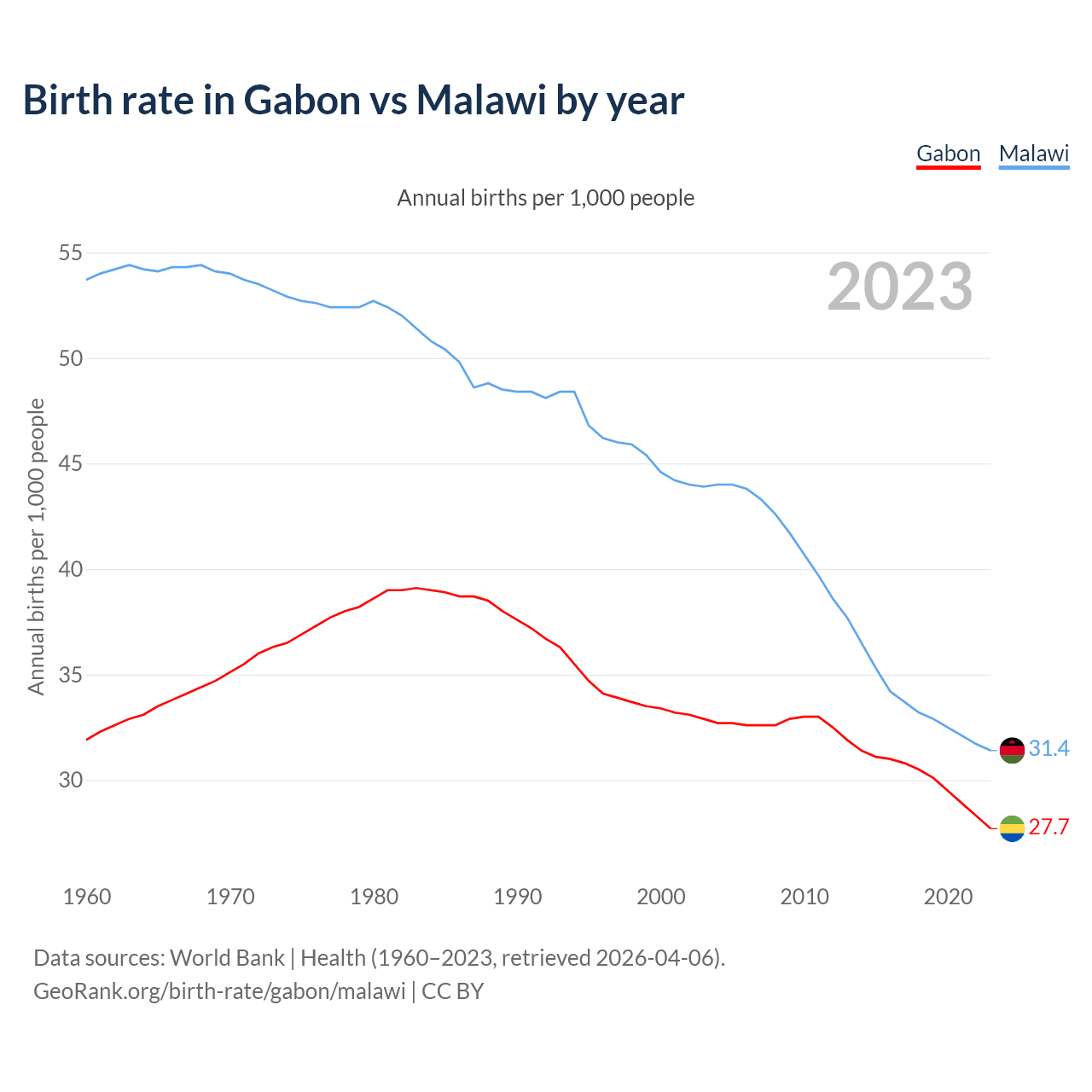 Gabon has an annual birth rate of 27.7 births per 1,000 people, compared to 31.4 for Malawi. The average number of children a woman is expected to have during her lifetime — the fertility rate, is 3.65 in Gabon and 3.65 in Malawi — 0.03% difference.