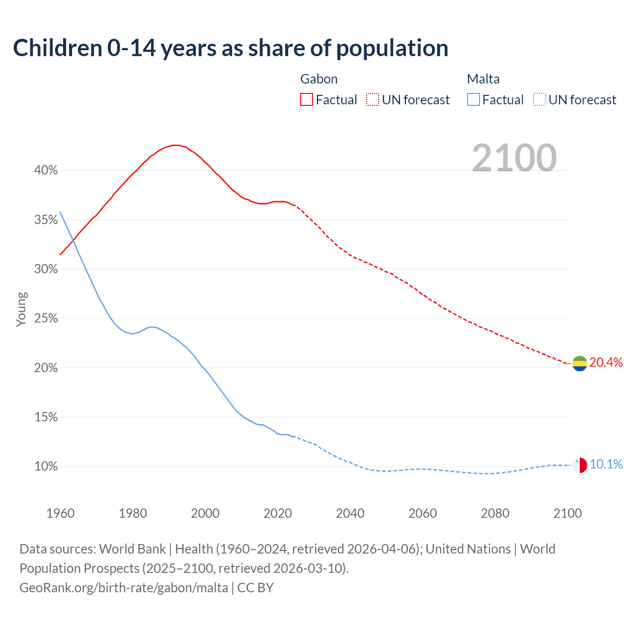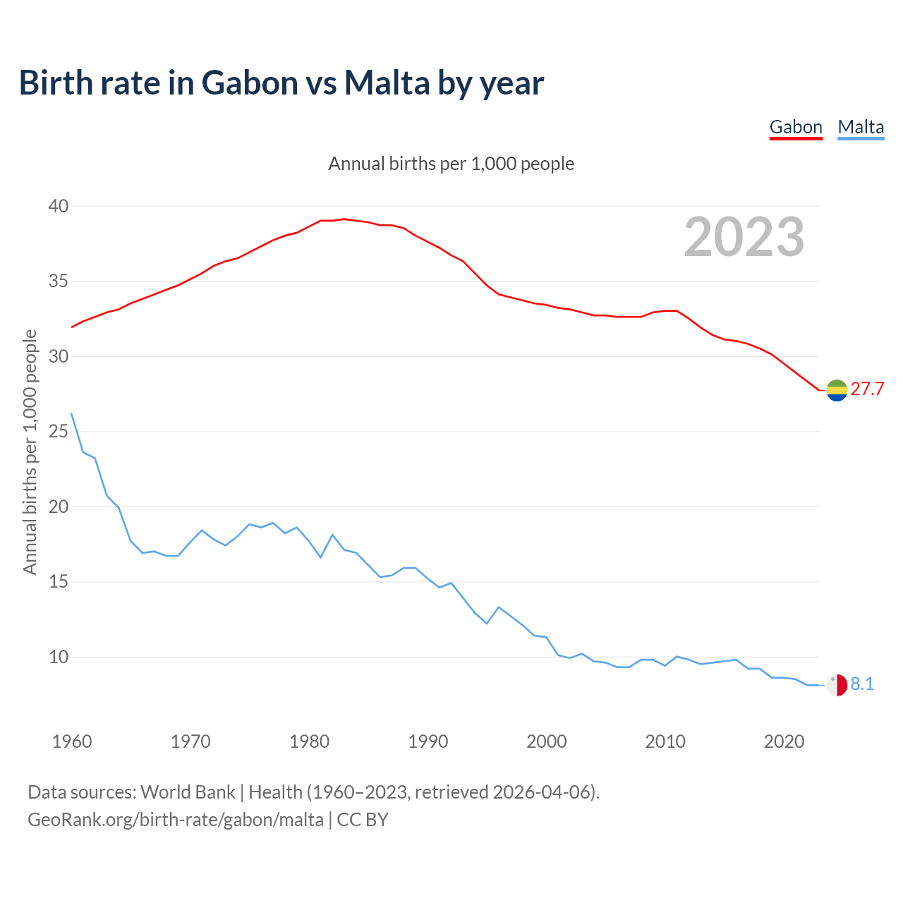 Gabon has an annual birth rate of 27.7 births per 1,000 people, compared to 8.1 for Malta. The average number of children a woman is expected to have during her lifetime — the fertility rate, is 3.65 in Gabon and 1.06 in Malta — 70.9% difference.