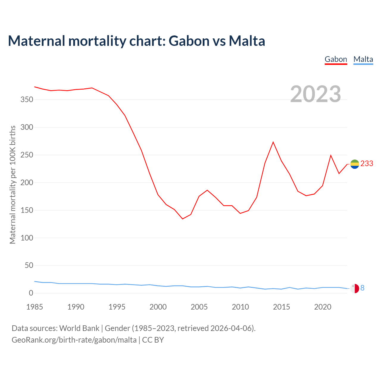 The maternal mortality rate, which is the probability of dying during childbirth or within 42 days of pregnancy termination, is 233 deaths per 100,000 live births in Gabon, compared to 8 deaths in Malta.
