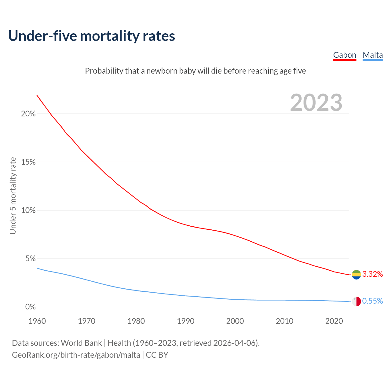 The chance that a newborn baby will die before reaching age five is 3.32% in Gabon and 0.55% in Malta. Above is a chart with historical data on under-five mortality rates.