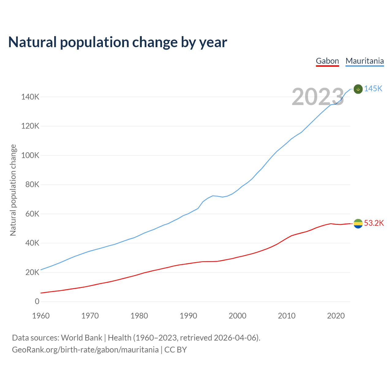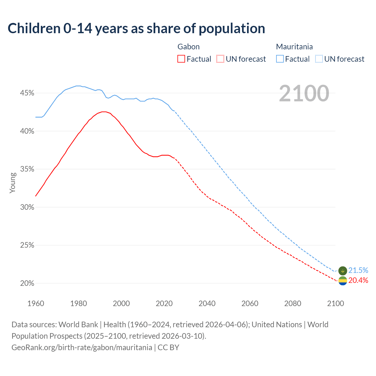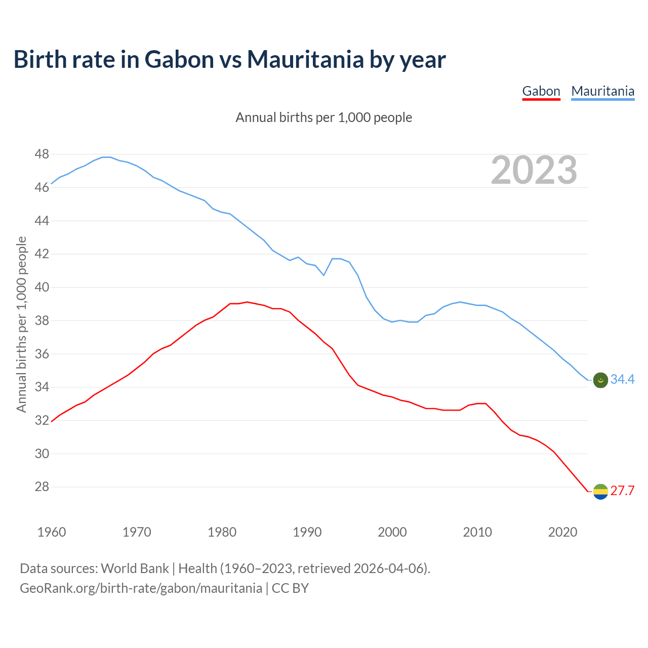 Gabon has an annual birth rate of 27.7 births per 1,000 people, compared to 34.4 for Mauritania. The average number of children a woman is expected to have during her lifetime — the fertility rate, is 3.65 in Gabon and 4.7 in Mauritania — 28.8% difference.
