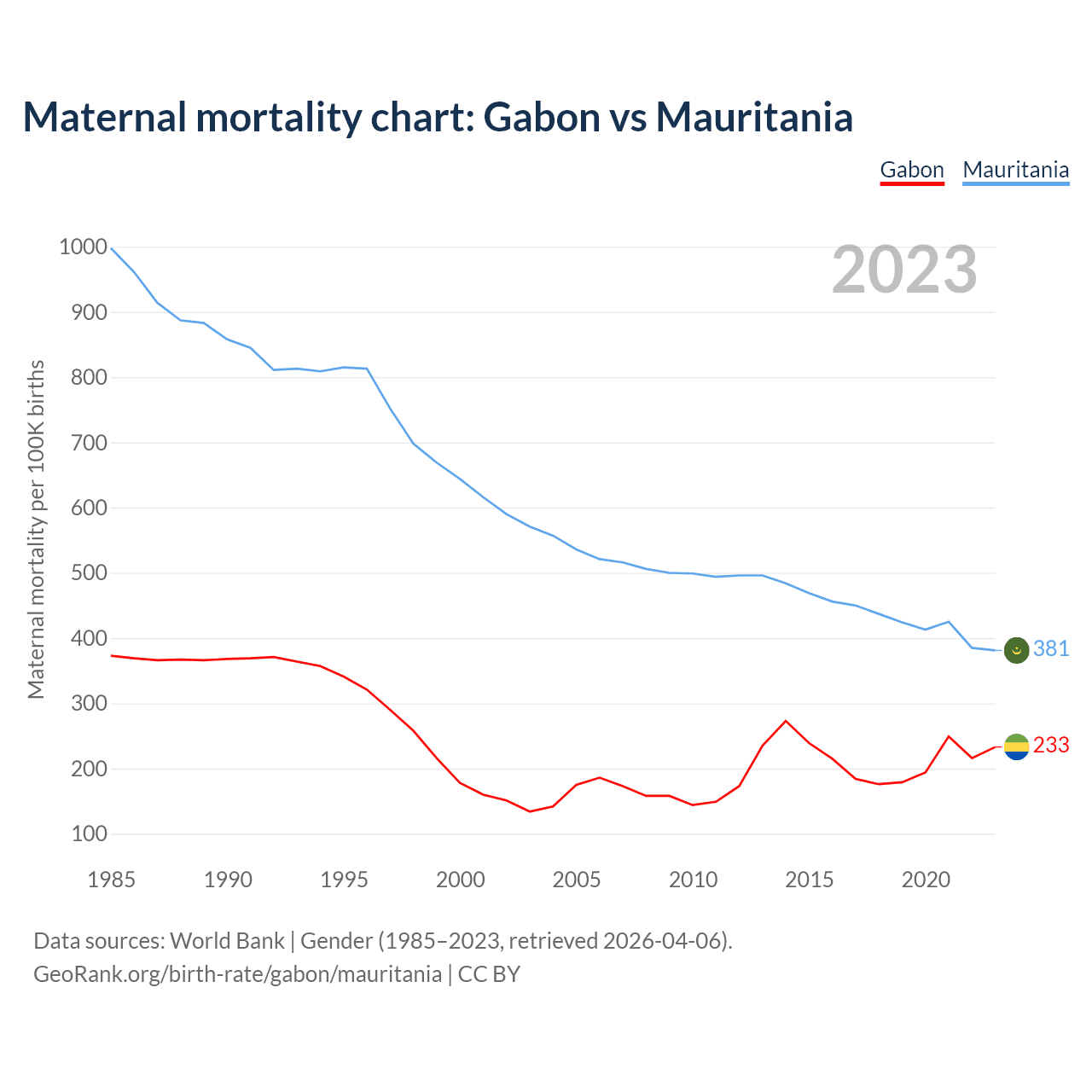 The maternal mortality rate, which is the probability of dying during childbirth or within 42 days of pregnancy termination, is 233 deaths per 100,000 live births in Gabon, compared to 381 deaths in Mauritania.