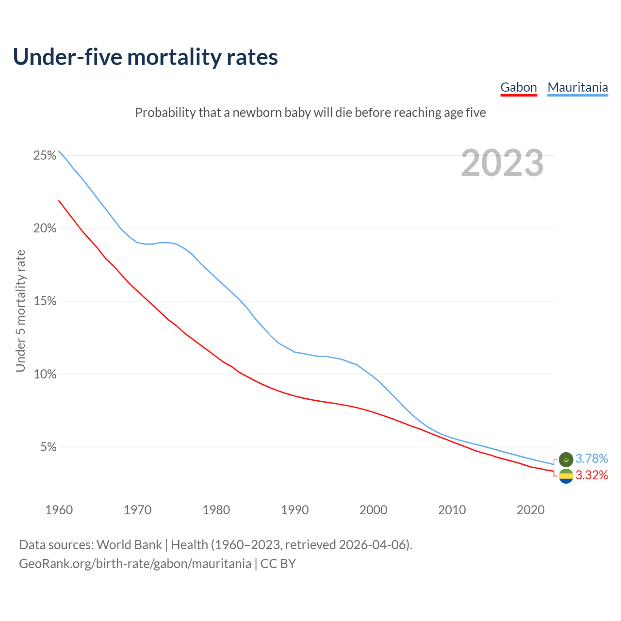 The chance that a newborn baby will die before reaching age five is 3.32% in Gabon and 3.78% in Mauritania. Above is a chart with historical data on under-five mortality rates.