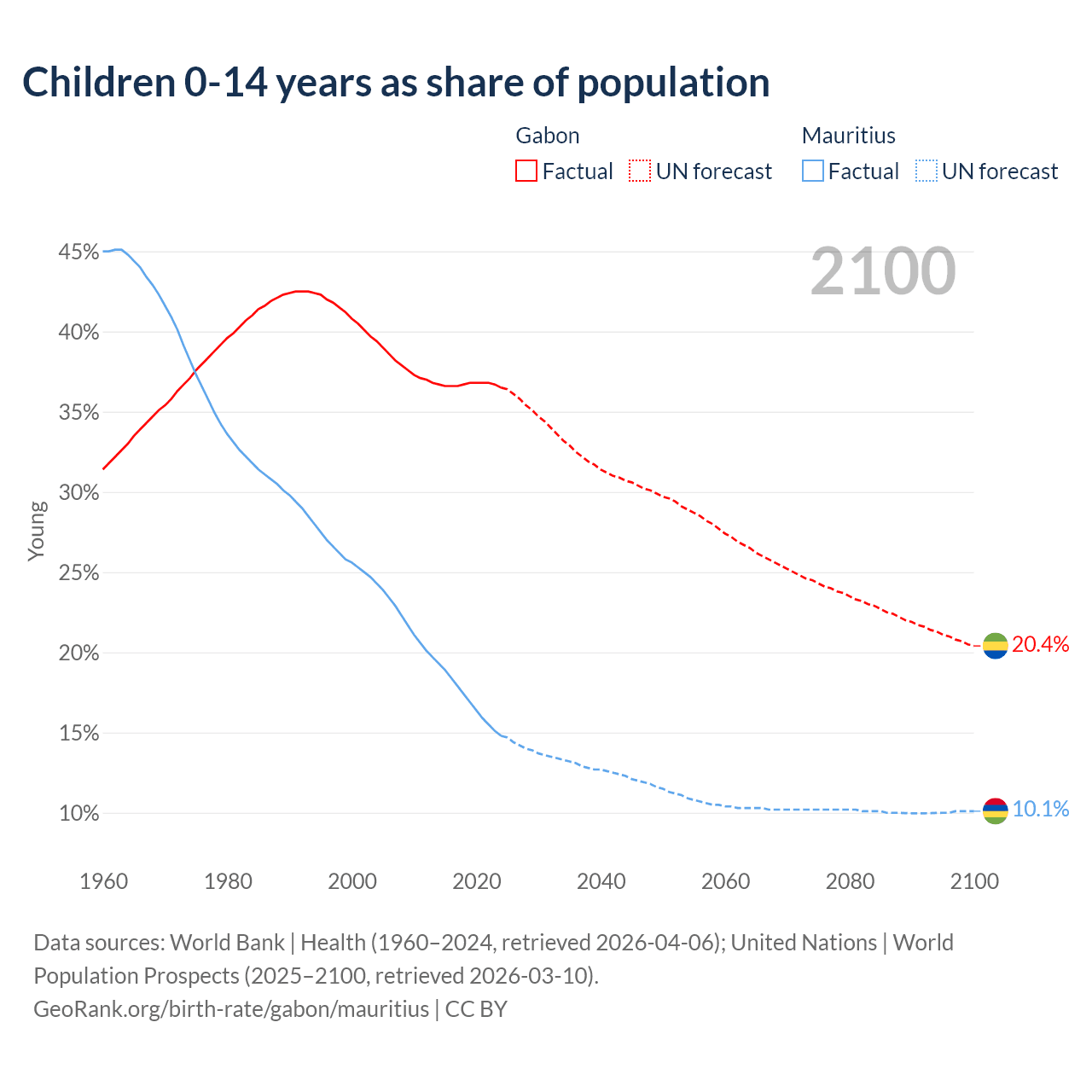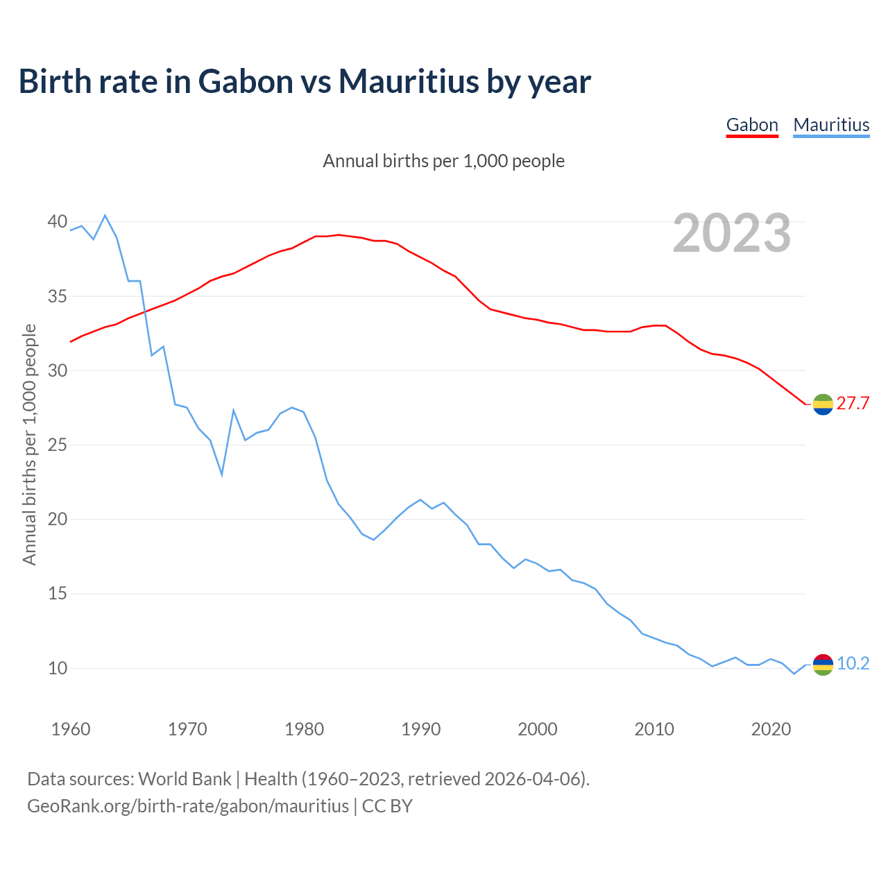 Gabon has an annual birth rate of 27.7 births per 1,000 people, compared to 10.2 for Mauritius. The average number of children a woman is expected to have during her lifetime — the fertility rate, is 3.65 in Gabon and 1.39 in Mauritius — 61.9% difference.