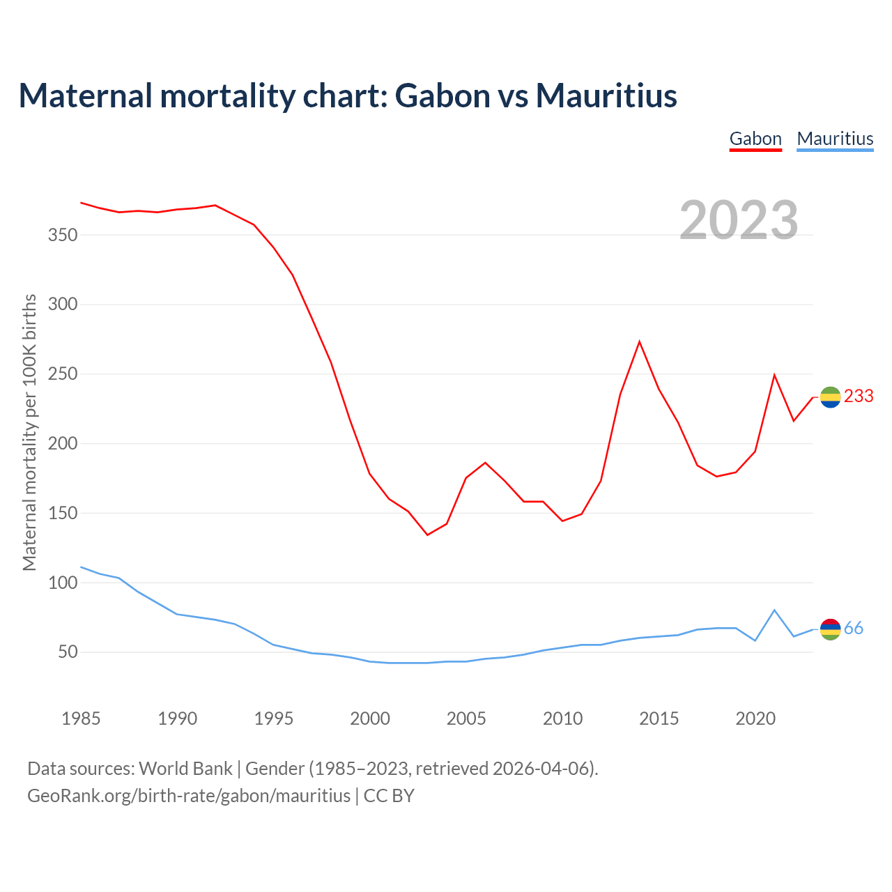 The maternal mortality rate, which is the probability of dying during childbirth or within 42 days of pregnancy termination, is 233 deaths per 100,000 live births in Gabon, compared to 66 deaths in Mauritius.