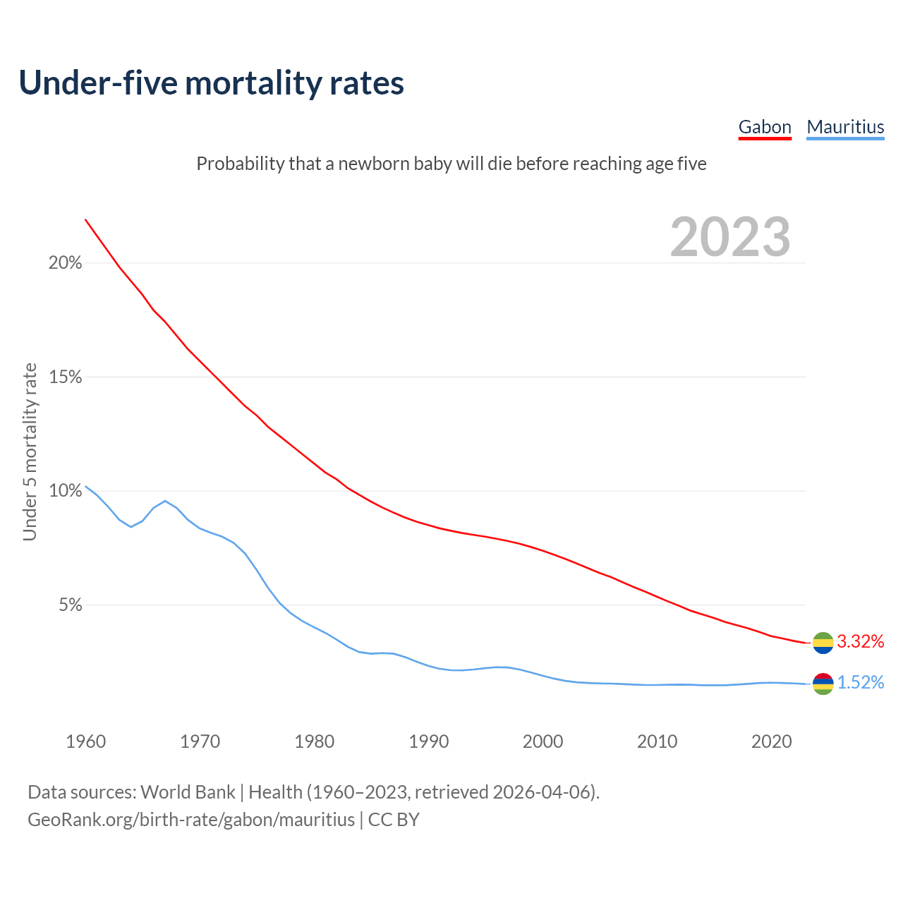 The chance that a newborn baby will die before reaching age five is 3.32% in Gabon and 1.52% in Mauritius. Above is a chart with historical data on under-five mortality rates.