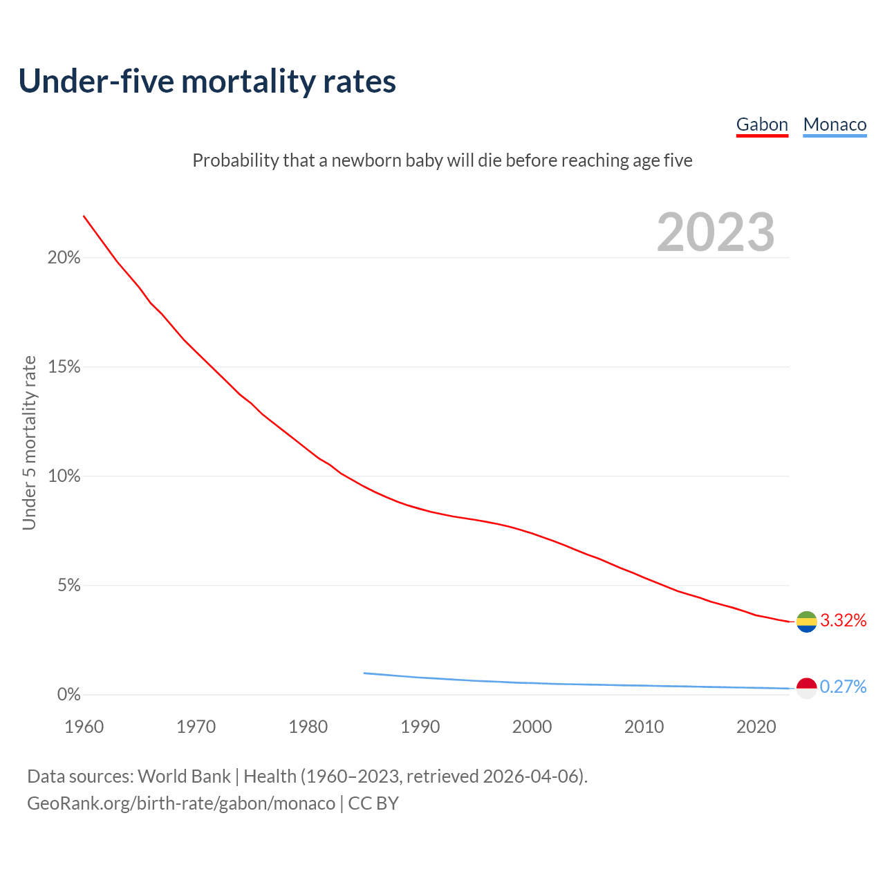 The chance that a newborn baby will die before reaching age five is 3.32% in Gabon and 0.27% in Monaco. Above is a chart with historical data on under-five mortality rates.