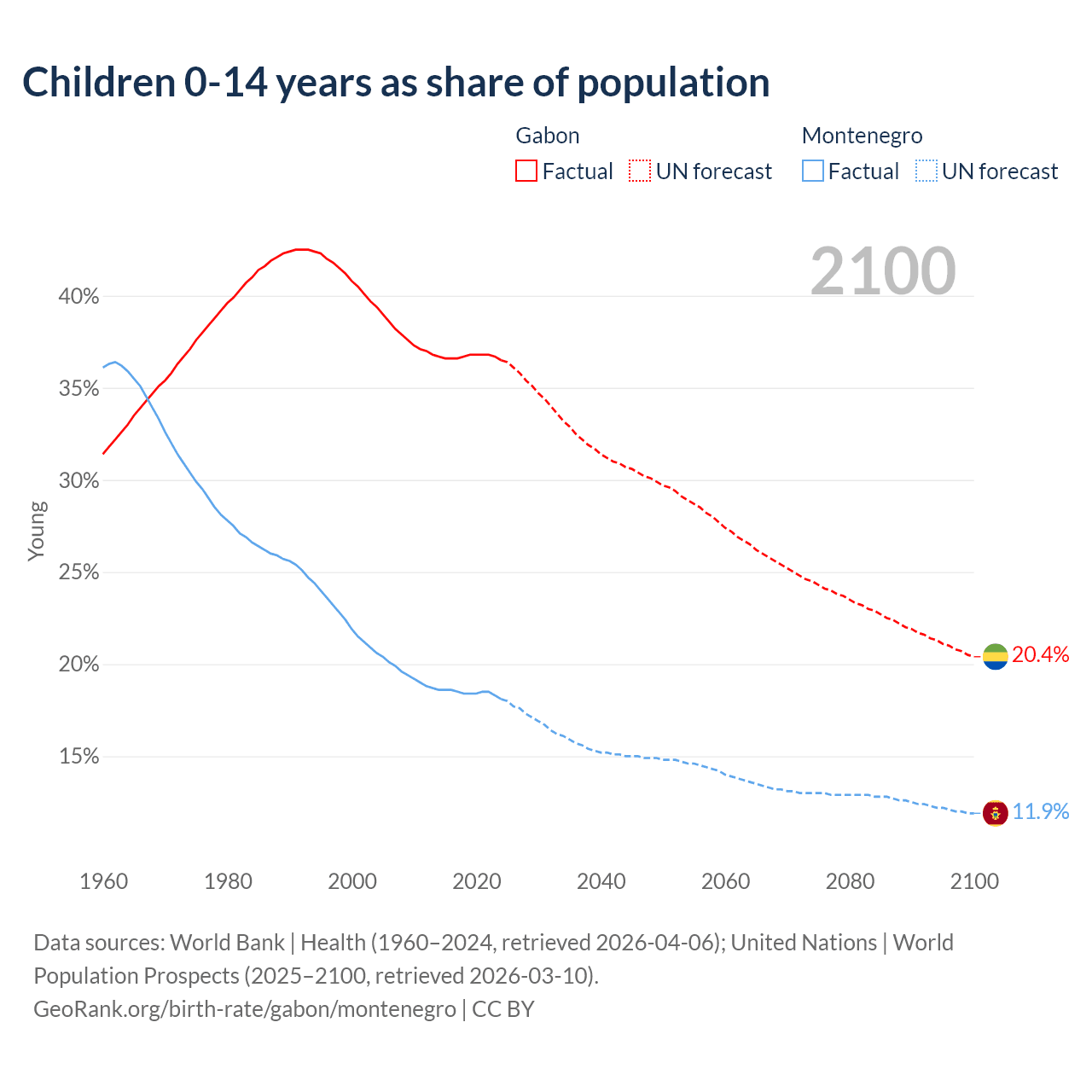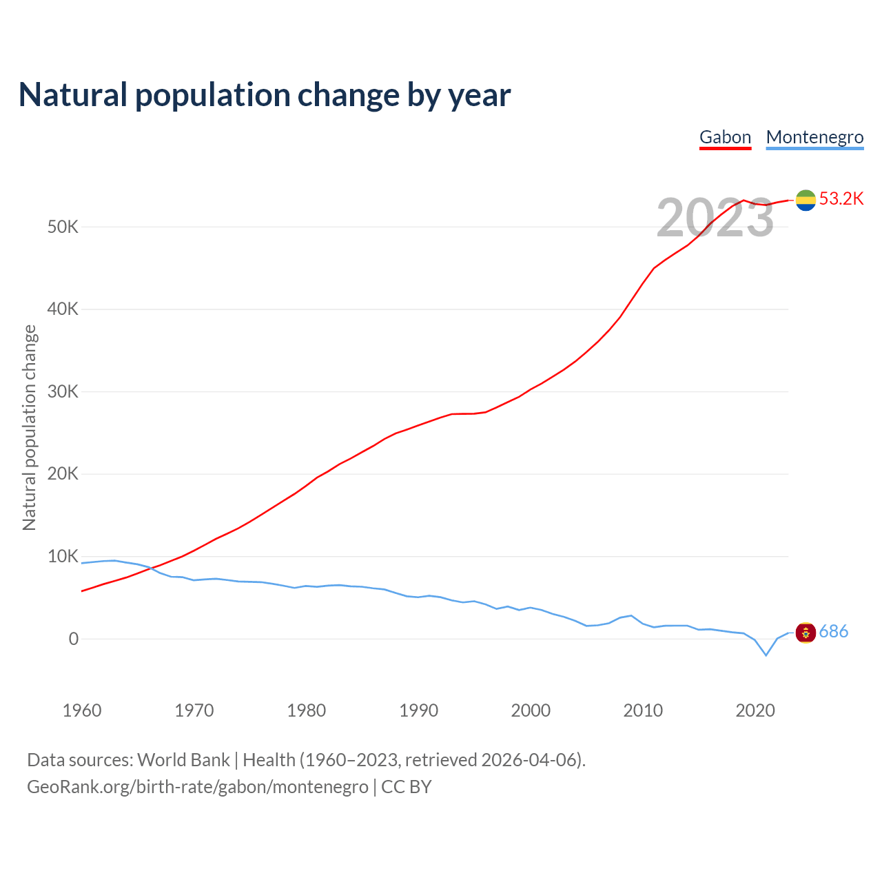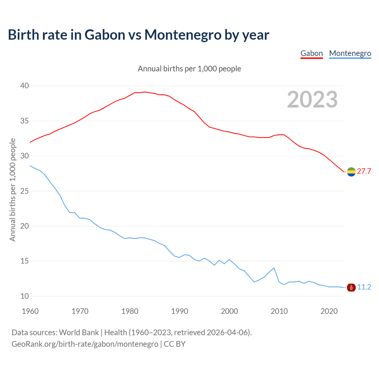 Gabon has an annual birth rate of 27.7 births per 1,000 people, compared to 11.2 for Montenegro. The average number of children a woman is expected to have during her lifetime — the fertility rate, is 3.65 in Gabon and 1.74 in Montenegro — 52.3% difference.