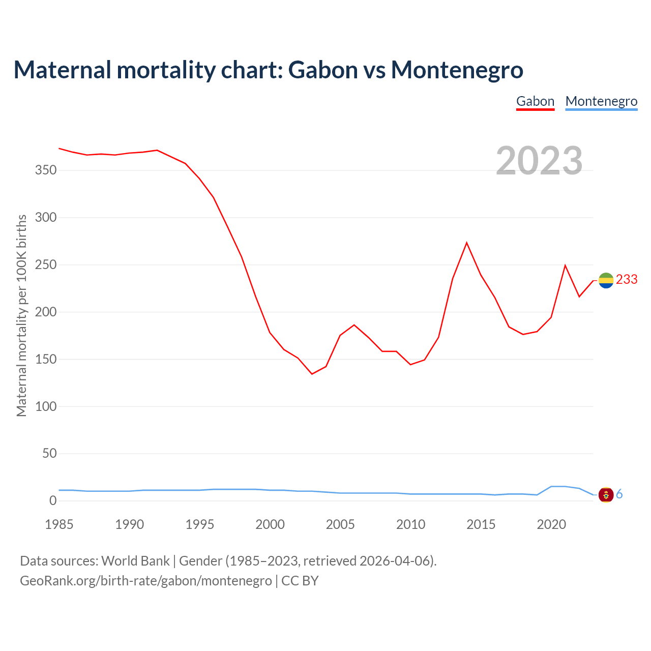 The maternal mortality rate, which is the probability of dying during childbirth or within 42 days of pregnancy termination, is 233 deaths per 100,000 live births in Gabon, compared to 6 deaths in Montenegro.