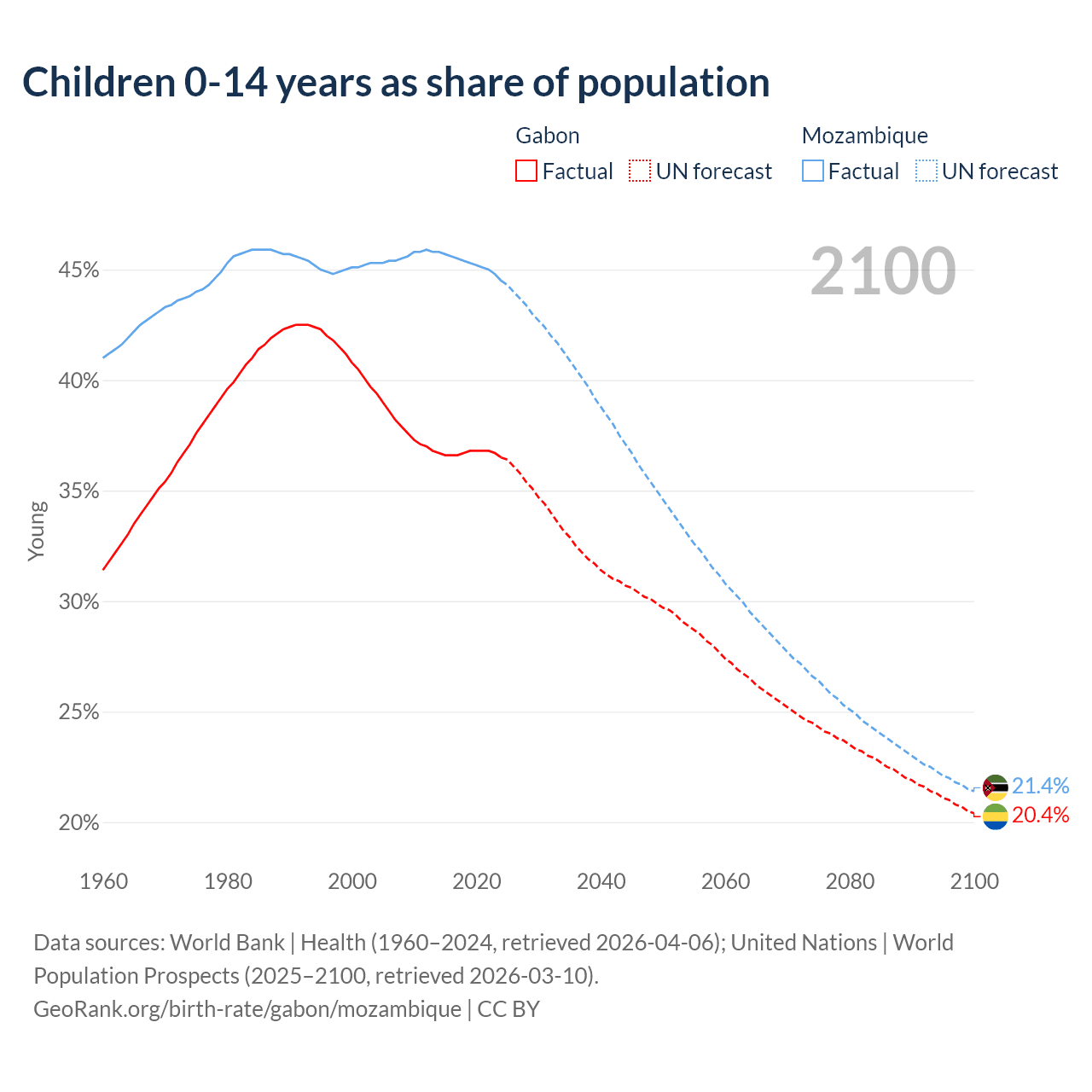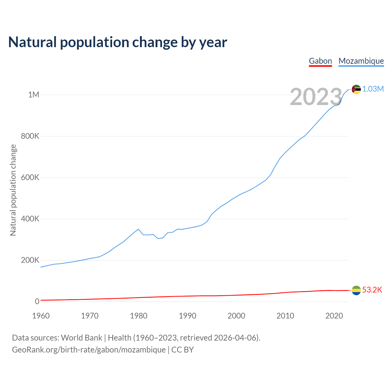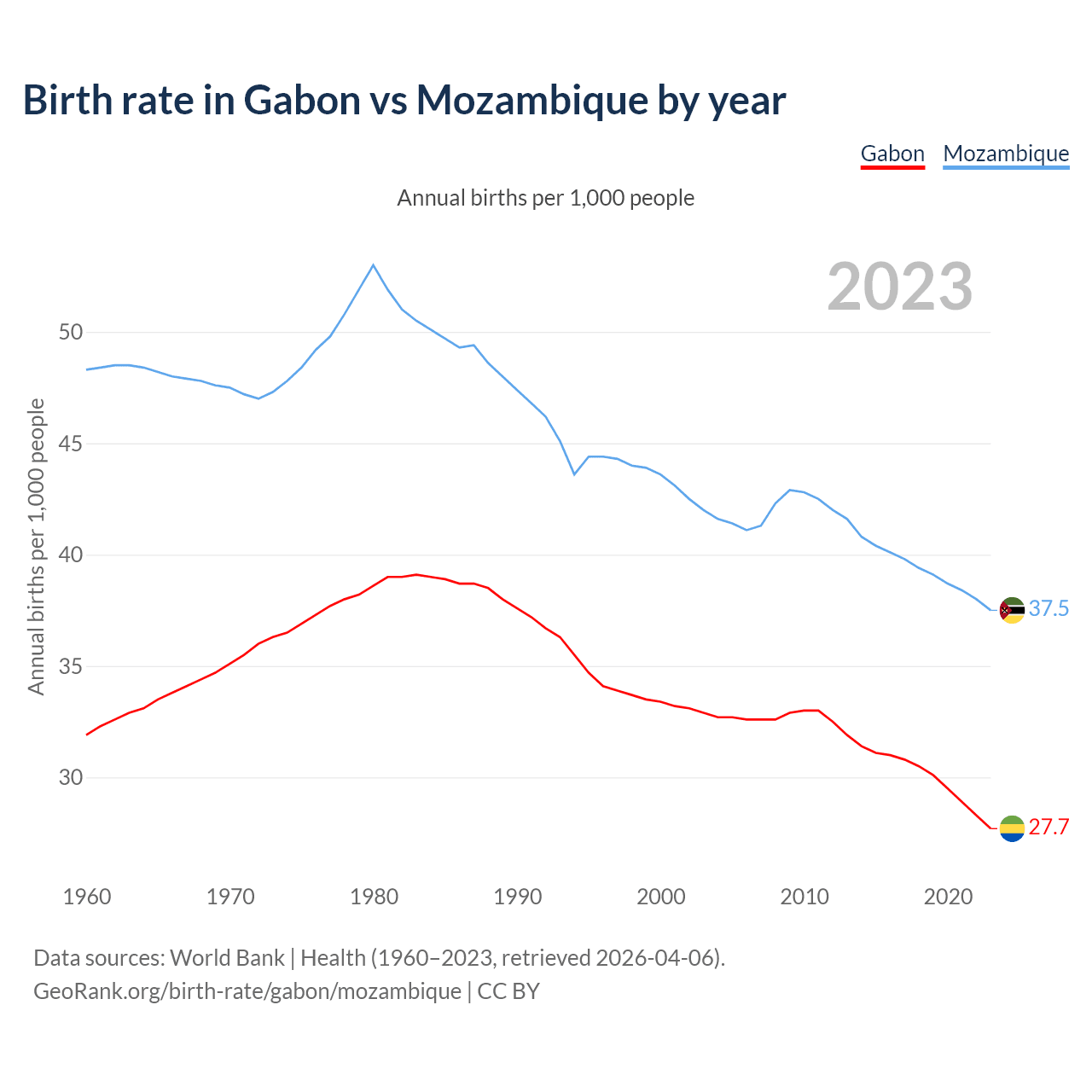 Gabon has an annual birth rate of 27.7 births per 1,000 people, compared to 37.5 for Mozambique. The average number of children a woman is expected to have during her lifetime — the fertility rate, is 3.65 in Gabon and 4.76 in Mozambique — 30.6% difference.