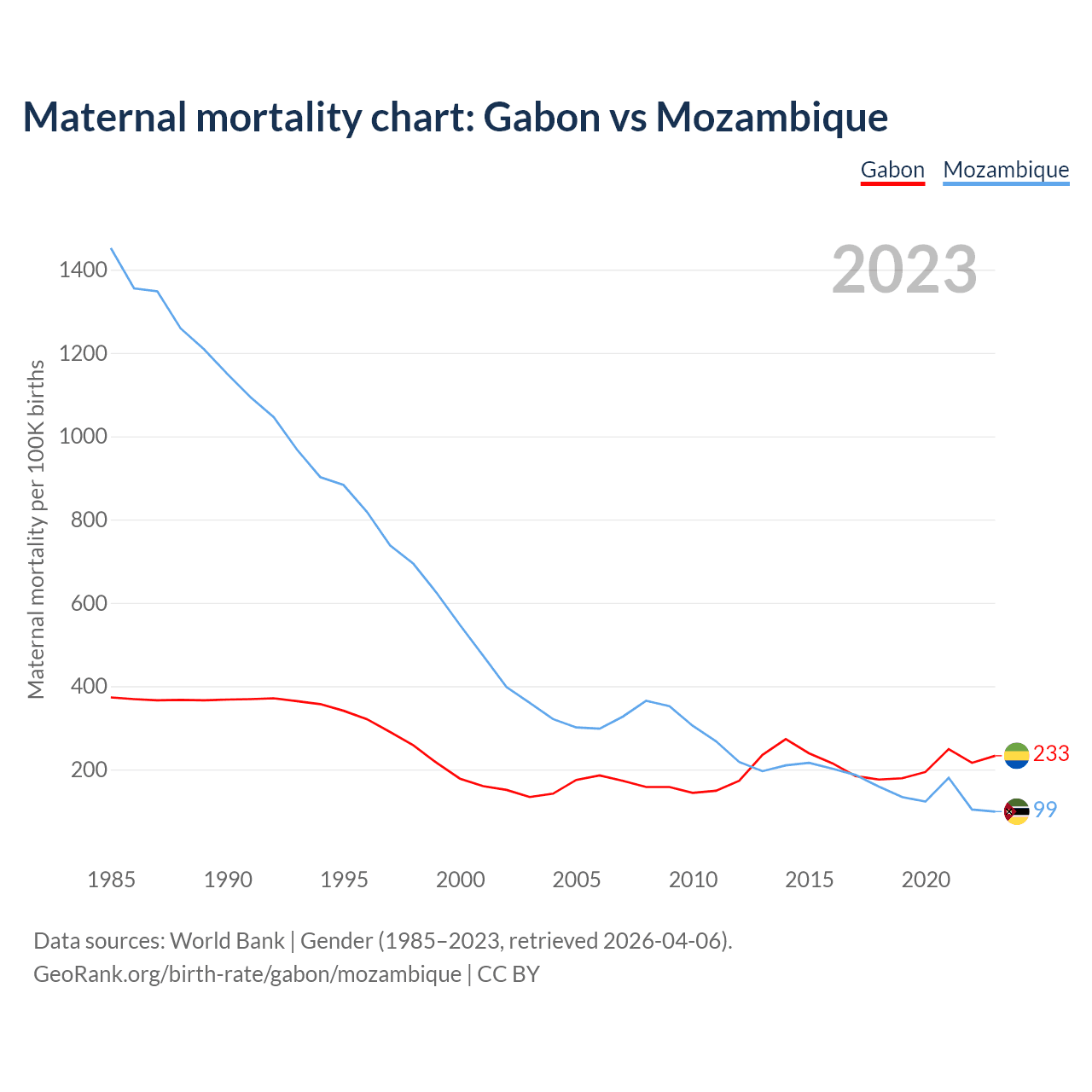 The maternal mortality rate, which is the probability of dying during childbirth or within 42 days of pregnancy termination, is 233 deaths per 100,000 live births in Gabon, compared to 99 deaths in Mozambique.