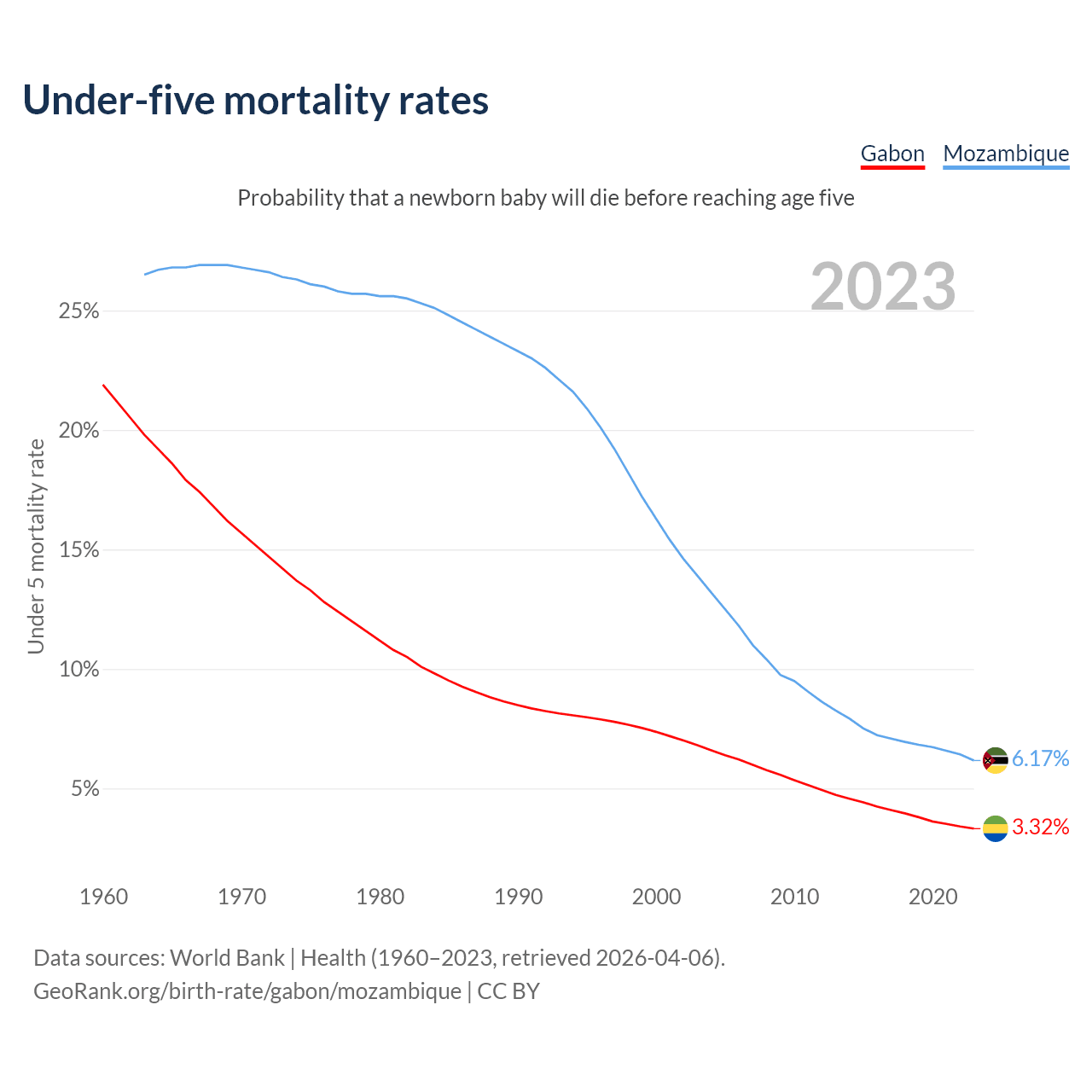 The chance that a newborn baby will die before reaching age five is 3.32% in Gabon and 6.17% in Mozambique. Above is a chart with historical data on under-five mortality rates.