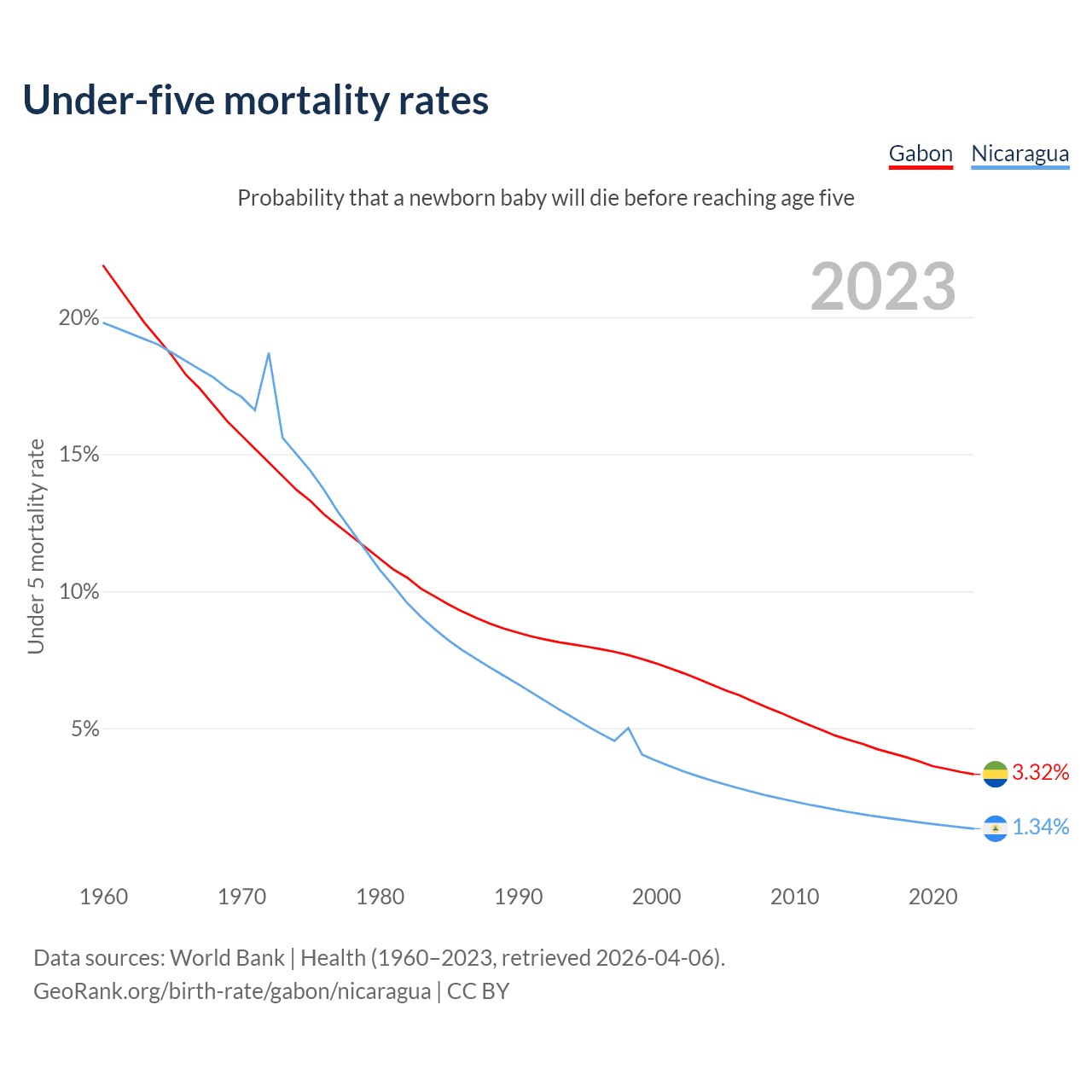 The chance that a newborn baby will die before reaching age five is 3.32% in Gabon and 1.34% in Nicaragua. Above is a chart with historical data on under-five mortality rates.