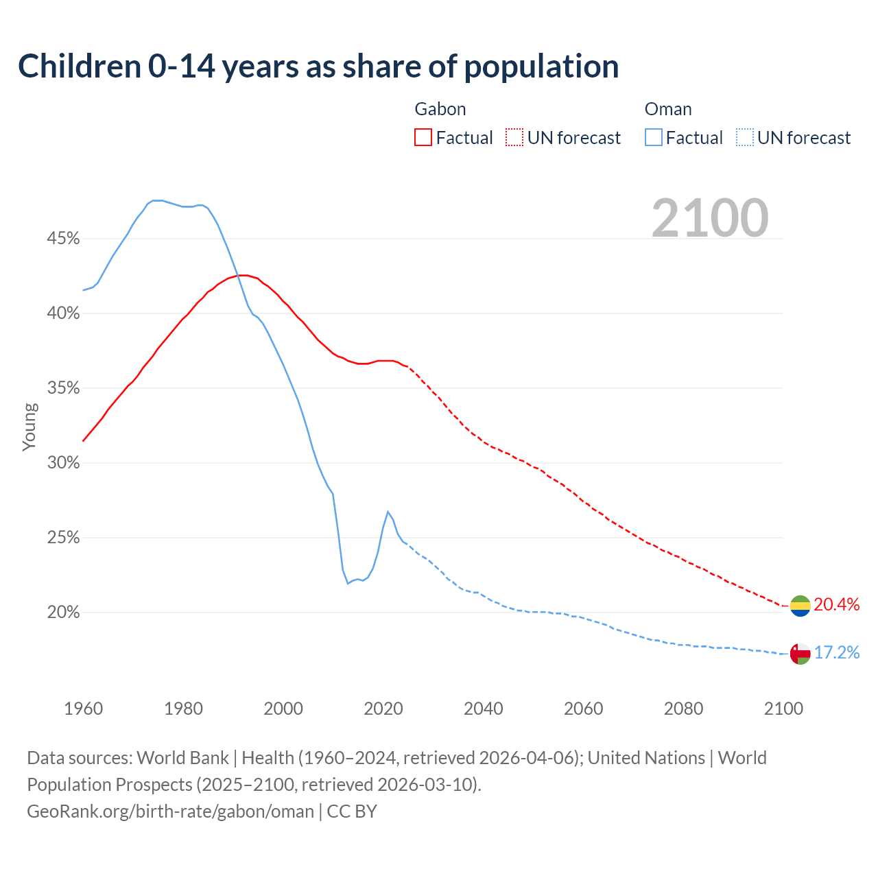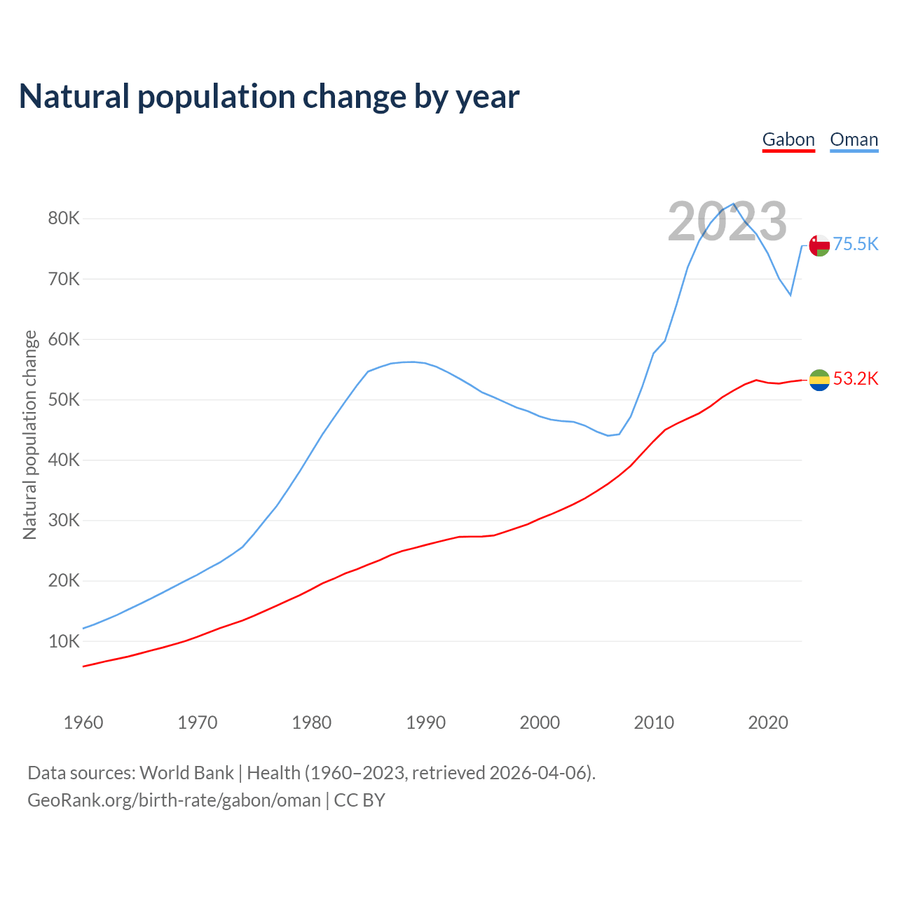 Gabon has an annual birth rate of 27.7 births per 1,000 people, compared to 16.8 for Oman. The average number of children a woman is expected to have during her lifetime — the fertility rate, is 3.65 in Gabon and 2.53 in Oman — 30.8% difference.