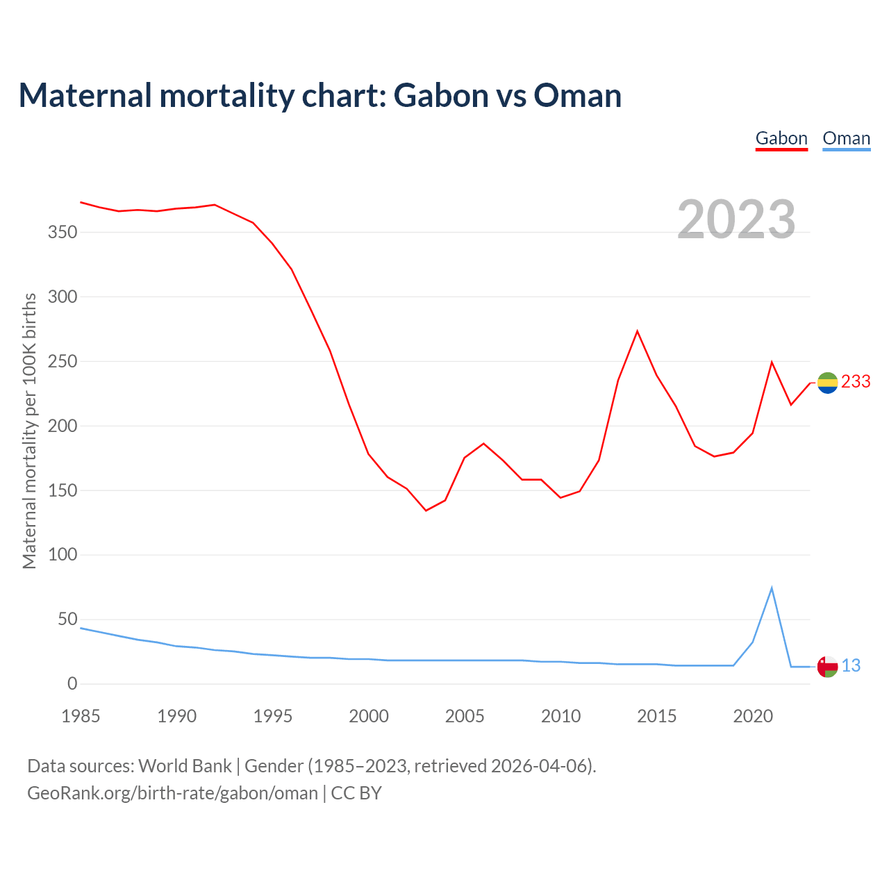 The maternal mortality rate, which is the probability of dying during childbirth or within 42 days of pregnancy termination, is 233 deaths per 100,000 live births in Gabon, compared to 13 deaths in Oman.