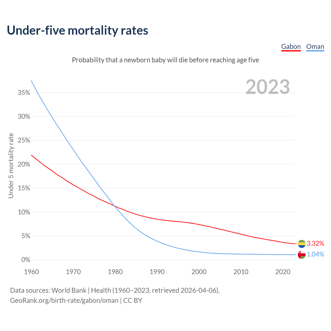 The chance that a newborn baby will die before reaching age five is 3.32% in Gabon and 1.04% in Oman. Above is a chart with historical data on under-five mortality rates.