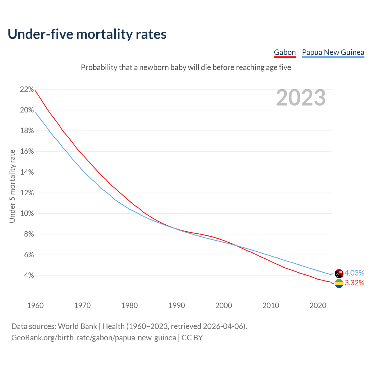The chance that a newborn baby will die before reaching age five is 3.32% in Gabon and 4.03% in Papua New Guinea. Above is a chart with historical data on under-five mortality rates.