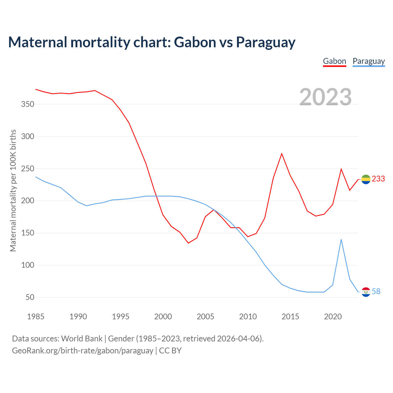 The maternal mortality rate, which is the probability of dying during childbirth or within 42 days of pregnancy termination, is 233 deaths per 100,000 live births in Gabon, compared to 58 deaths in Paraguay.
