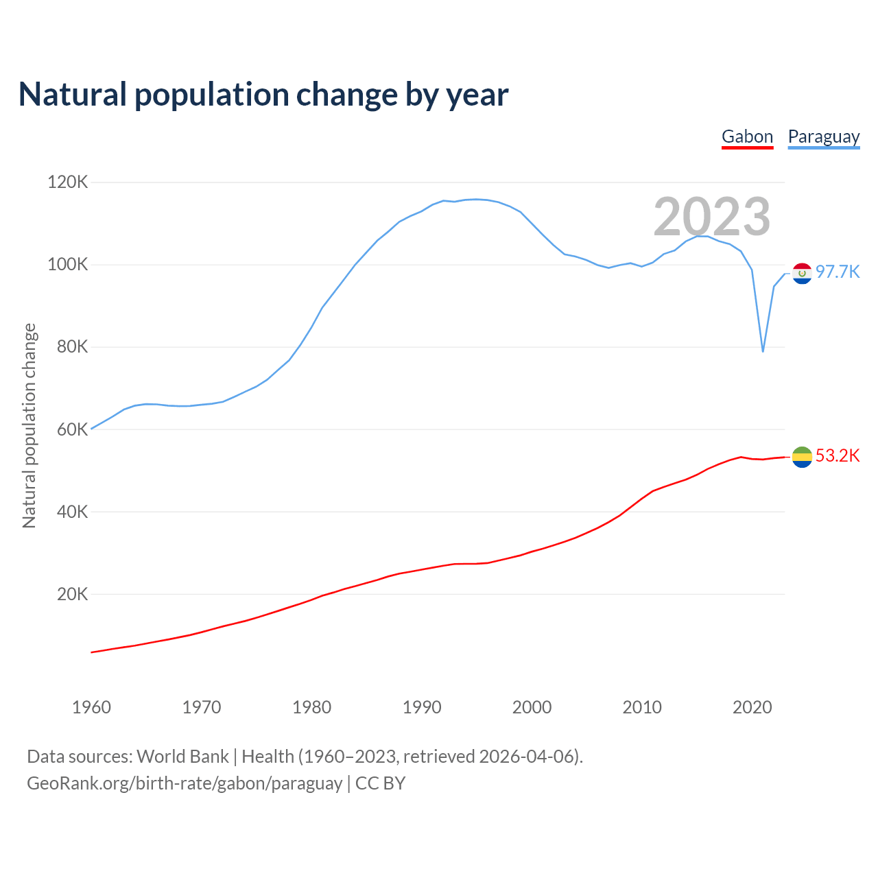 According to the latest available data on birth rates, the fertility rate in Gabon was 3.65 children per woman in 2023, compared to 2.42 in Paraguay in 2023. The replacement level is considered to be 2.1 children per woman.