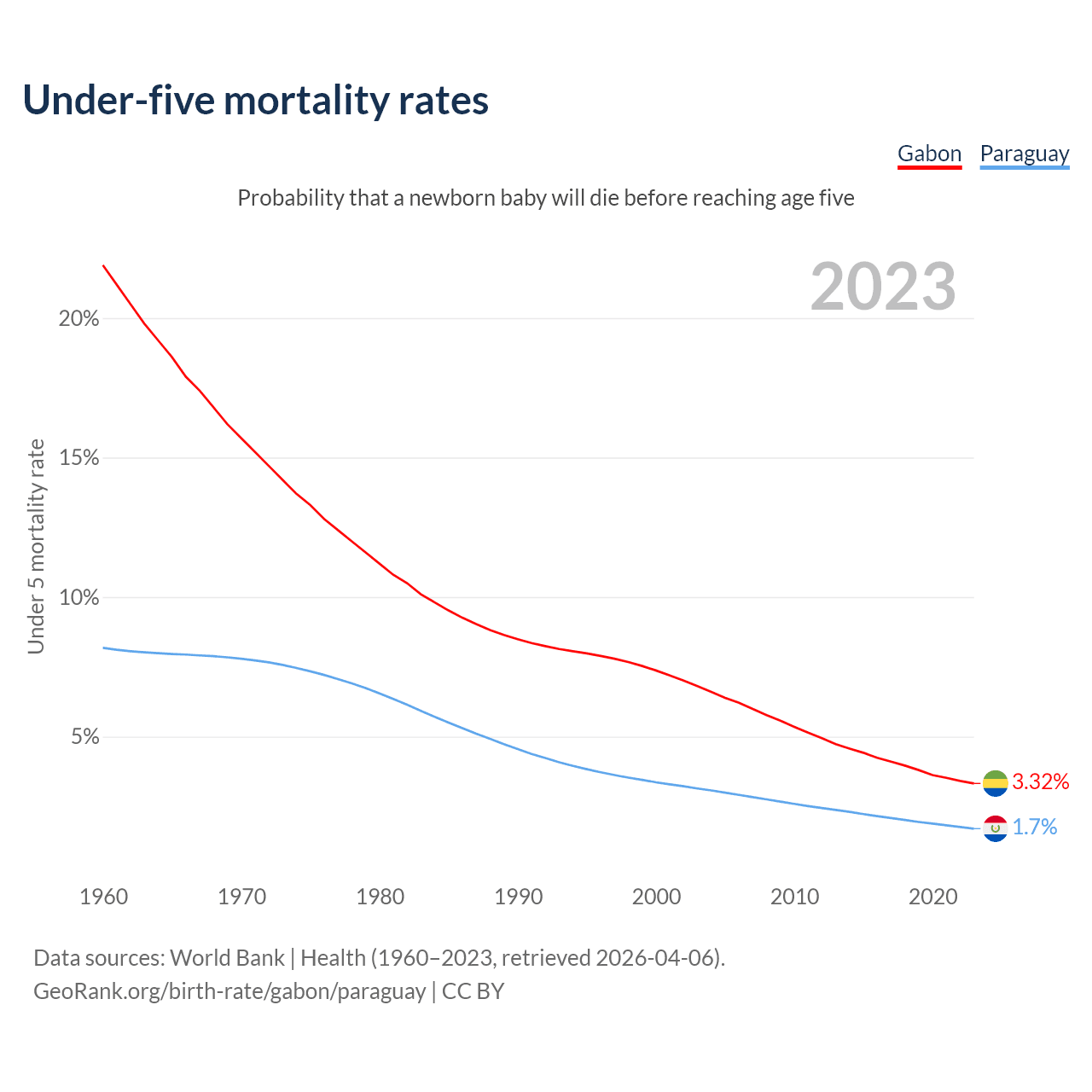 The chance that a newborn baby will die before reaching age five is 3.32% in Gabon and 1.7% in Paraguay. Above is a chart with historical data on under-five mortality rates.