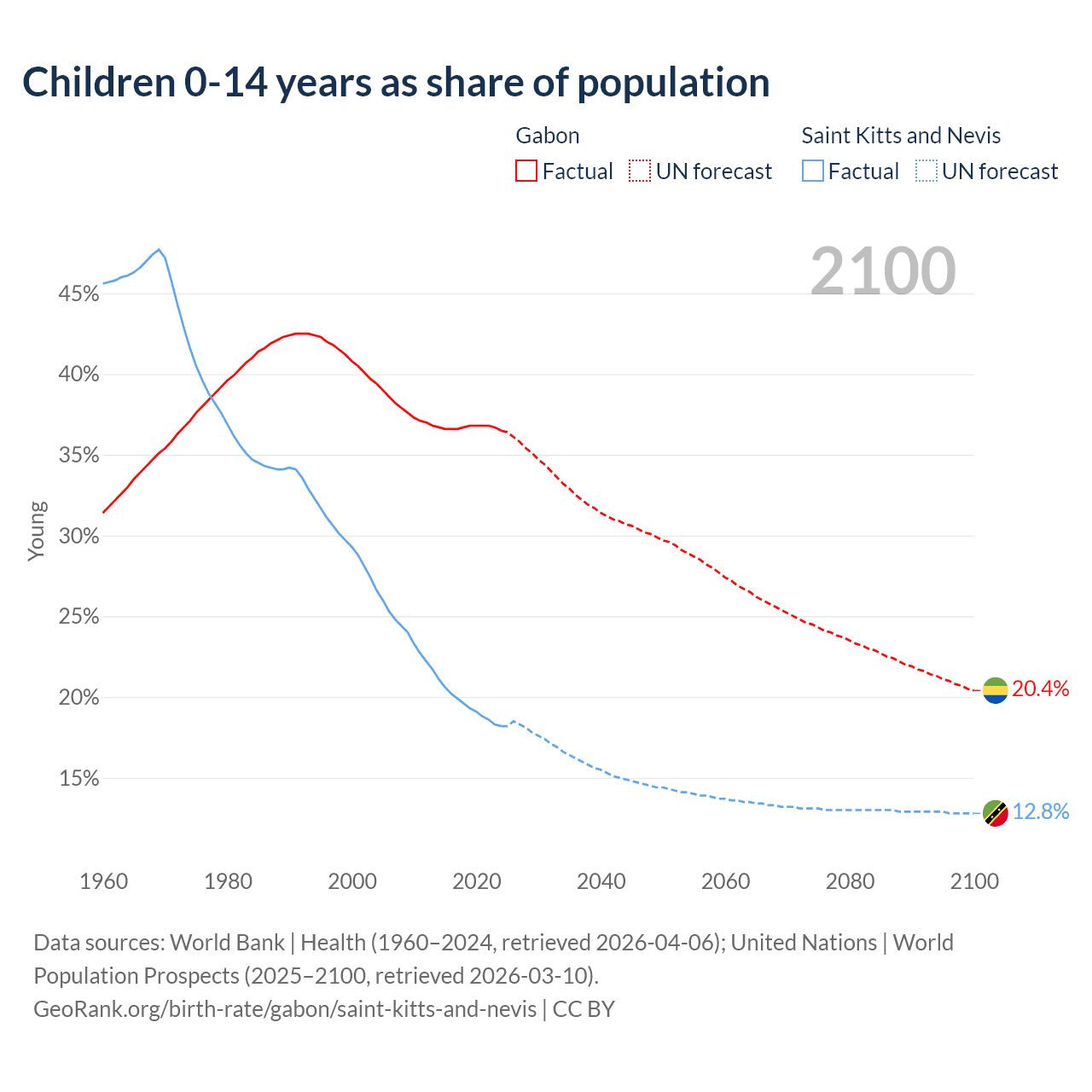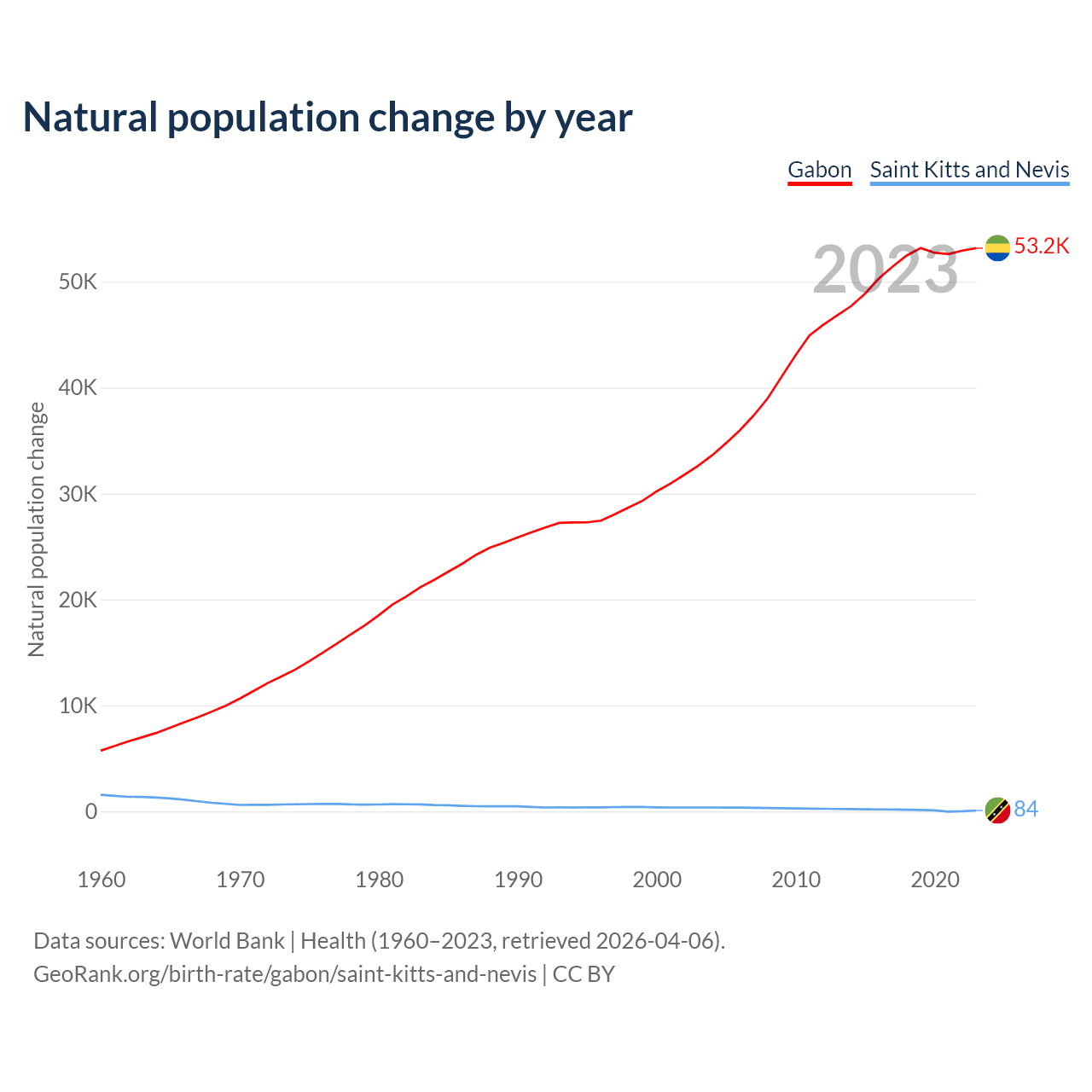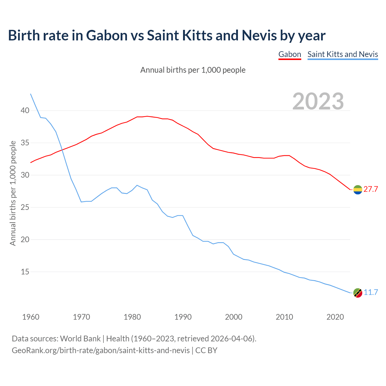 Gabon has an annual birth rate of 27.7 births per 1,000 people, compared to 11.7 for Saint Kitts and Nevis. The average number of children a woman is expected to have during her lifetime — the fertility rate, is 3.65 in Gabon and 1.51 in Saint Kitts and Nevis — 58.7% difference.