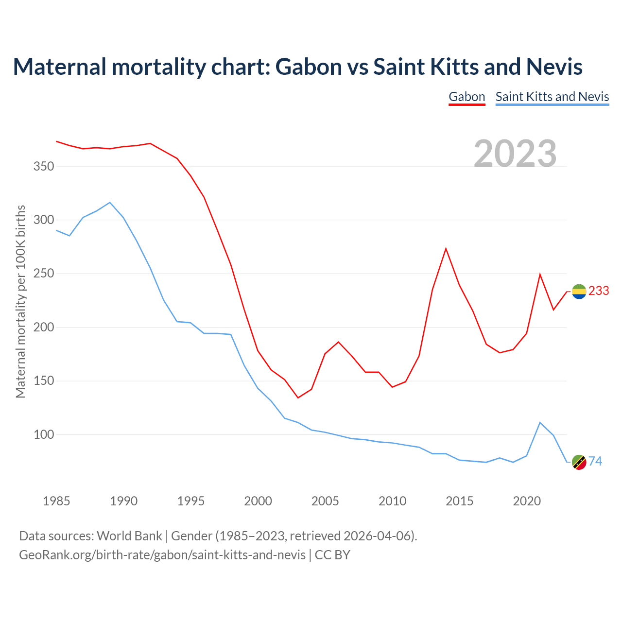 The maternal mortality rate, which is the probability of dying during childbirth or within 42 days of pregnancy termination, is 233 deaths per 100,000 live births in Gabon, compared to 74 deaths in Saint Kitts and Nevis.