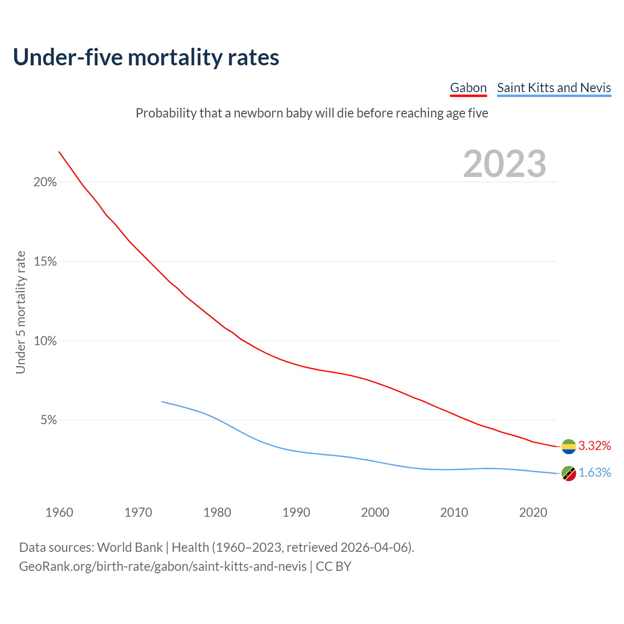 The chance that a newborn baby will die before reaching age five is 3.32% in Gabon and 1.63% in Saint Kitts and Nevis. Above is a chart with historical data on under-five mortality rates.